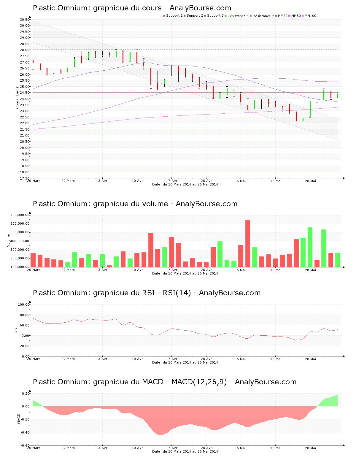 On repère que ce lundi 26 mai l’indicateur MACD est en augmentation. Il représente dorénavant une trajectoire du titre en vigoureuse augmentation sur le court-moyen terme. En ce qui concerne l’indicateur RSI, on repère qu’il est en croissance ce lundi 26 mai. Il est passé dans le niveau d’achat, cela pourrait caractériser un départ de tendance croissante sur la durée pour la valeur Plastic Omnium.