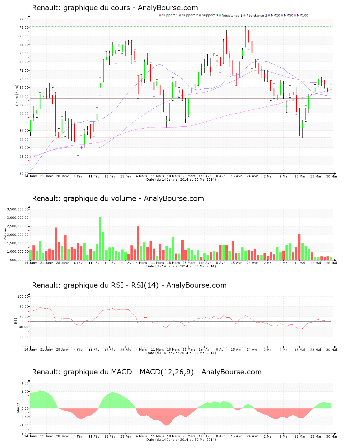 Avec un parcours stable de 0.55%, Renault est en une semaine peu demandé. La demande sur le titre depuis un mois est par contre neutre, illustrée par un cours en décroissance de 1.14%. Renault est sur un an remarquablement sollicité, avec un développement en substantielle hausse de 16.85%.