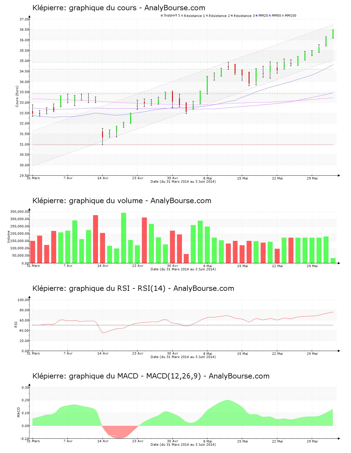 Représentée par un mouvement haussier de 1.09%, la volonté d’achat sur l’action Klépierre aujourd’hui est toujours bien présente, avec un volume à 11:14 d’environ 32000 actions échangées. Avec un parcours en progression de 1.35%, cette dernière était déjà hier recherchée. Démarrant à 36.100 € pour parvenir à 36.495 €, la valeur gonfle maintenant de 0.395 €. L’action Klépierre est maintenant en croissance constante depuis 6 jours de cotations. La demande sur le cours de Klépierre depuis le mardi 27 mai 2014 est par conséquent extrêmement forte, symbolisée par un comportement haussier de 4.72%.