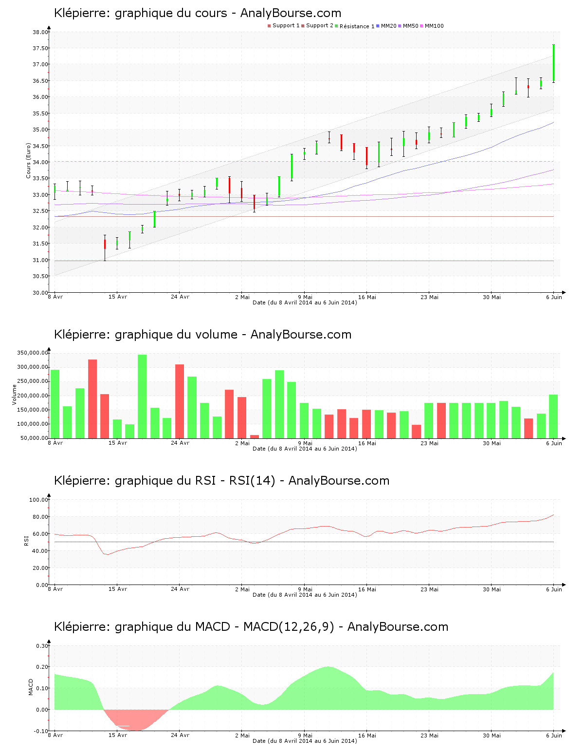 Depuis la semaine dernière, l’action Klépierre accélère son mouvement croissant. Avec un parcours haussier de 5.57%, cette dernière est en substantielle progression ces dernières séances. La valeur atteint dorénavant 37.605 €. Klépierre supportait déjà la semaine dernière une pression acheteuse, imprégnée par un cours croissant de 2.03%. La valeur se place très au-dessus de son canal. Elle ne fluctue en effet plus dans le canal à l’intérieur duquel elle se déployait depuis un certain temps. La valeur a acquis 18.01%, depuis le mercredi 16 avril 2014, jour de son entrée dans le canal.