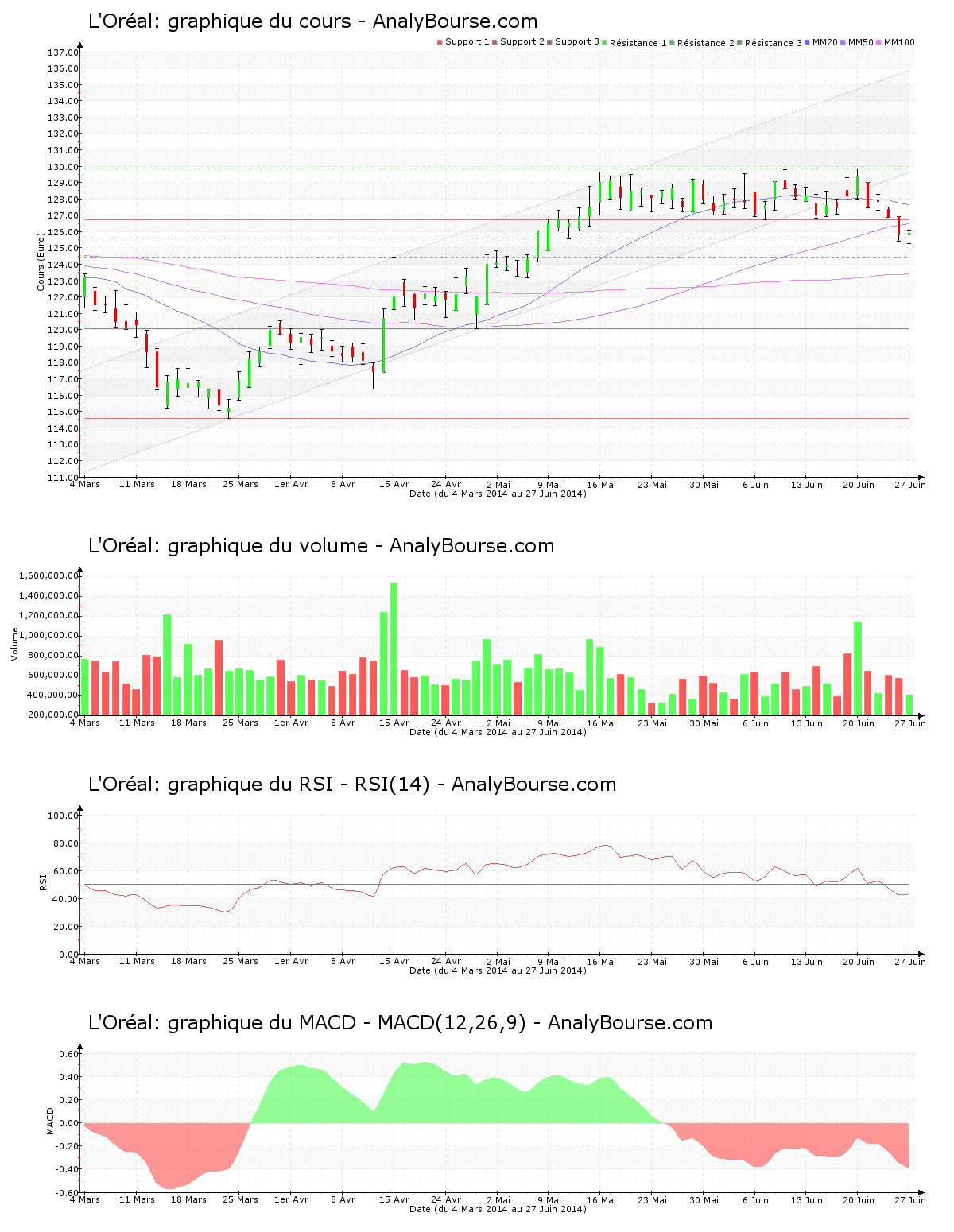 Pour les indicateurs, la moyenne mobile sur vingt jours de la valeur L’Oréal est positionnée au-delà de sa moyenne mobile sur cinquante jours, qui est elle-même positionnée au-dessus de sa moyenne mobile sur cent jours. Sur une longue période, la valeur traduit donc un mouvement en croissance. Depuis maintenant 44 séances de cotations, la moyenne mobile sur vingt jours de la valeur L’Oréal se trouve au-delà de sa moyenne mobile sur cinquante jours. Ensuite, l’indicateur RSI est ces cinq derniers jours en baisse. Il se situe finalement dans le niveau de vente. Pour terminer, l’indicateur MACD est ces derniers jours en importante baisse. C’est finalement une tendance du titre en ferme régression que ce dernier dévoile sur le moyen-court terme.