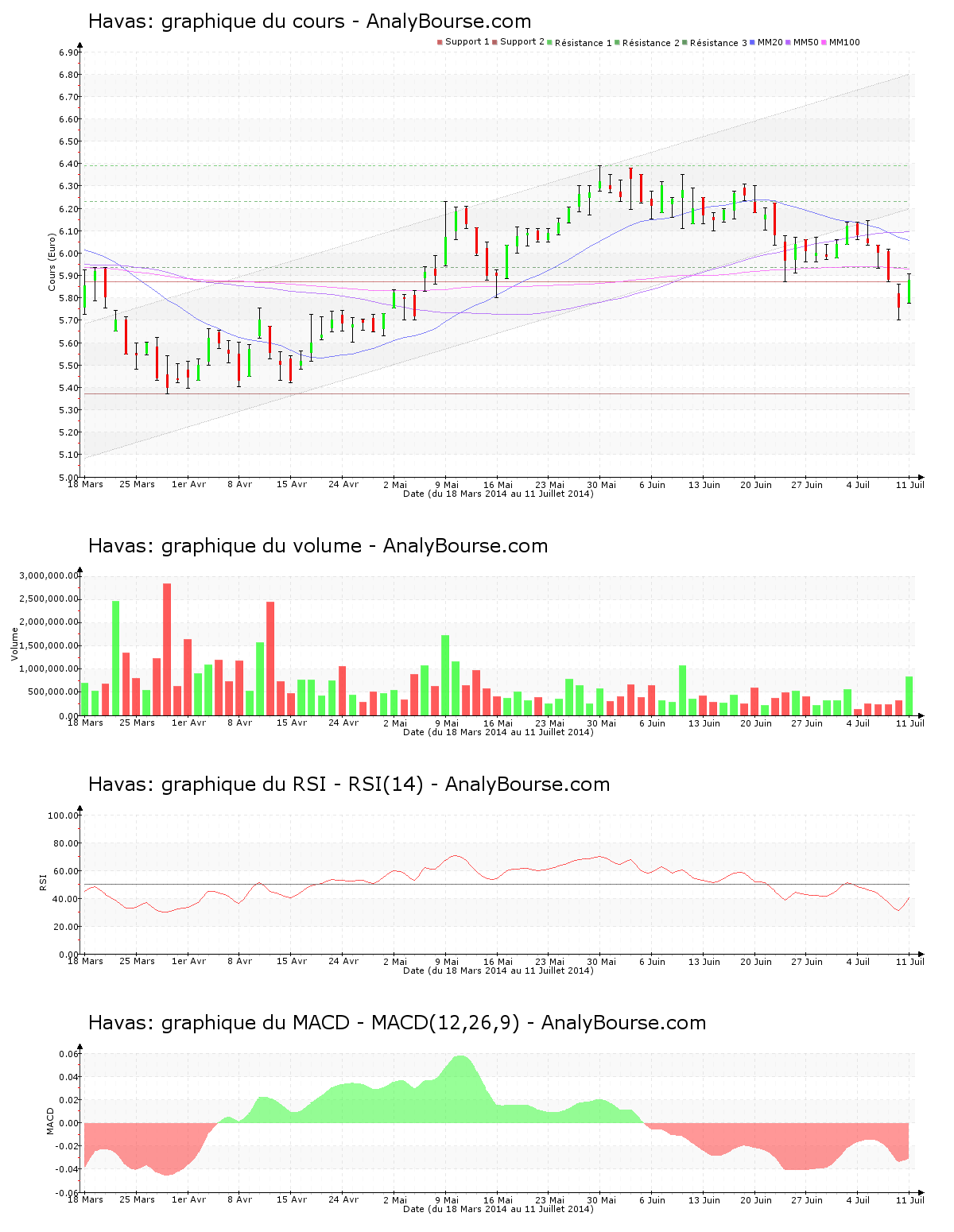 Havas montre ces dernières séances une pression vendeuse, affectée par un développement baissier de 3.29%. L’action se monnaye finalement à 5.880 €. Havas affichait à l’inverse la semaine dernière une pression acheteuse, reflétée par un parcours haussier de 1.16%. La tendance s’inverse donc faiblement ces dernières séances. C’est la première fois que l’action Havas passe ce seuil depuis le mercredi 7 mai 2014. Le titre varie à présent à proximité du support des 5.871 €. Enfin, observons, avec un pourcentage de 7.82% séparant ces cinq derniers jours de cotations le plus haut du plus bas, une certaine agitation sur Havas. La valeur navigue largement en deçà de son canal. Elle ne fluctue en effet plus dans le canal dans lequel elle se bornait ces dernières semaines.