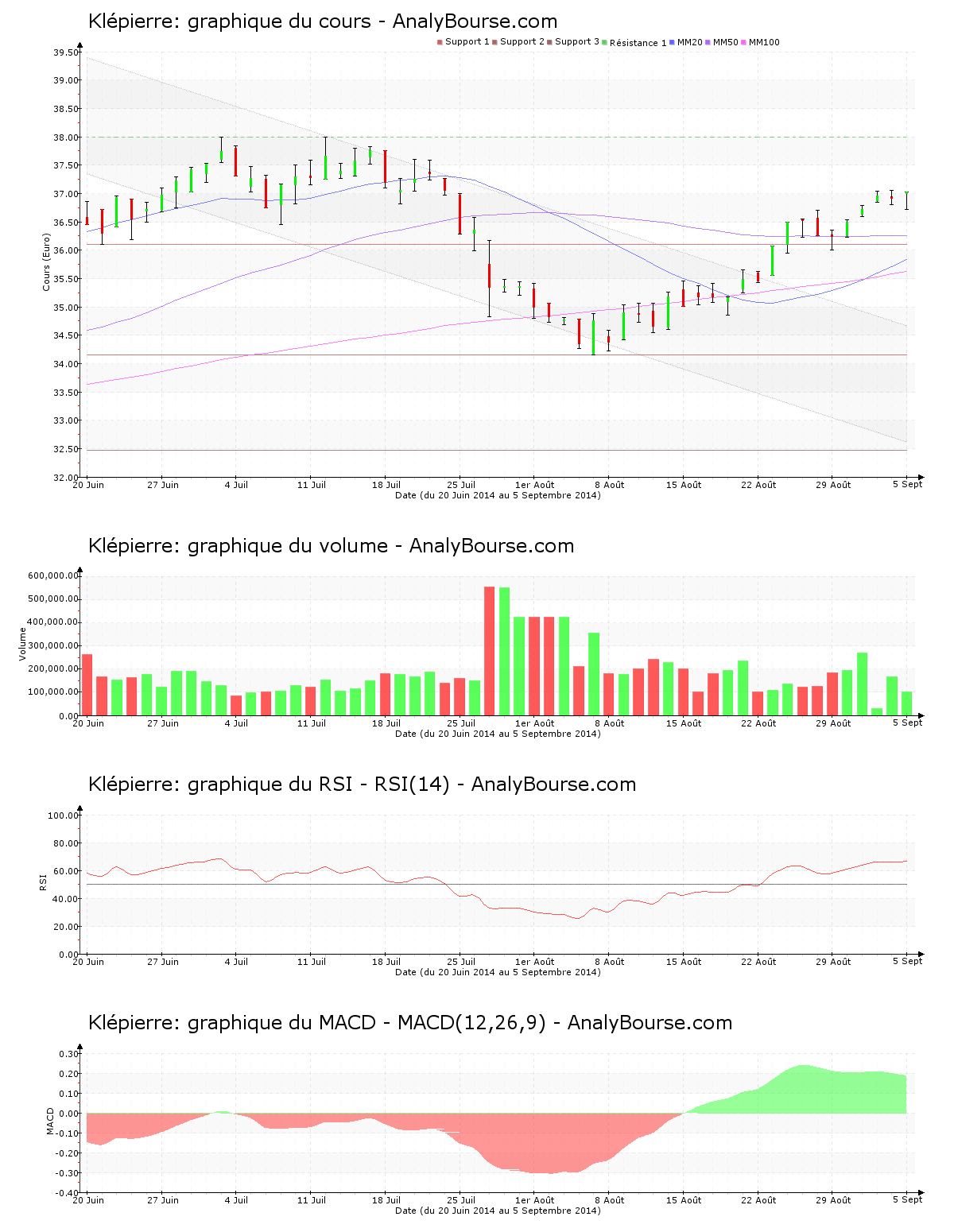 Côté indicateurs, en ce qui concerne le MACD, on observe que ce dernier est en baisse cette semaine. Ce dernier signale toutefois encore une tendance du cours en vigoureuse hausse sur le court-moyen terme. De son côté, on constate que l’indicateur RSI est plutôt stable ces cinq derniers jours de cotations. Il se positionne par conséquent toujours au niveau d’achat. Pour finir, depuis maintenant 74 séances de cotations, la moyenne mobile sur cinquante jours de la valeur Klépierre se localise au-delà de sa moyenne mobile sur cent jours.