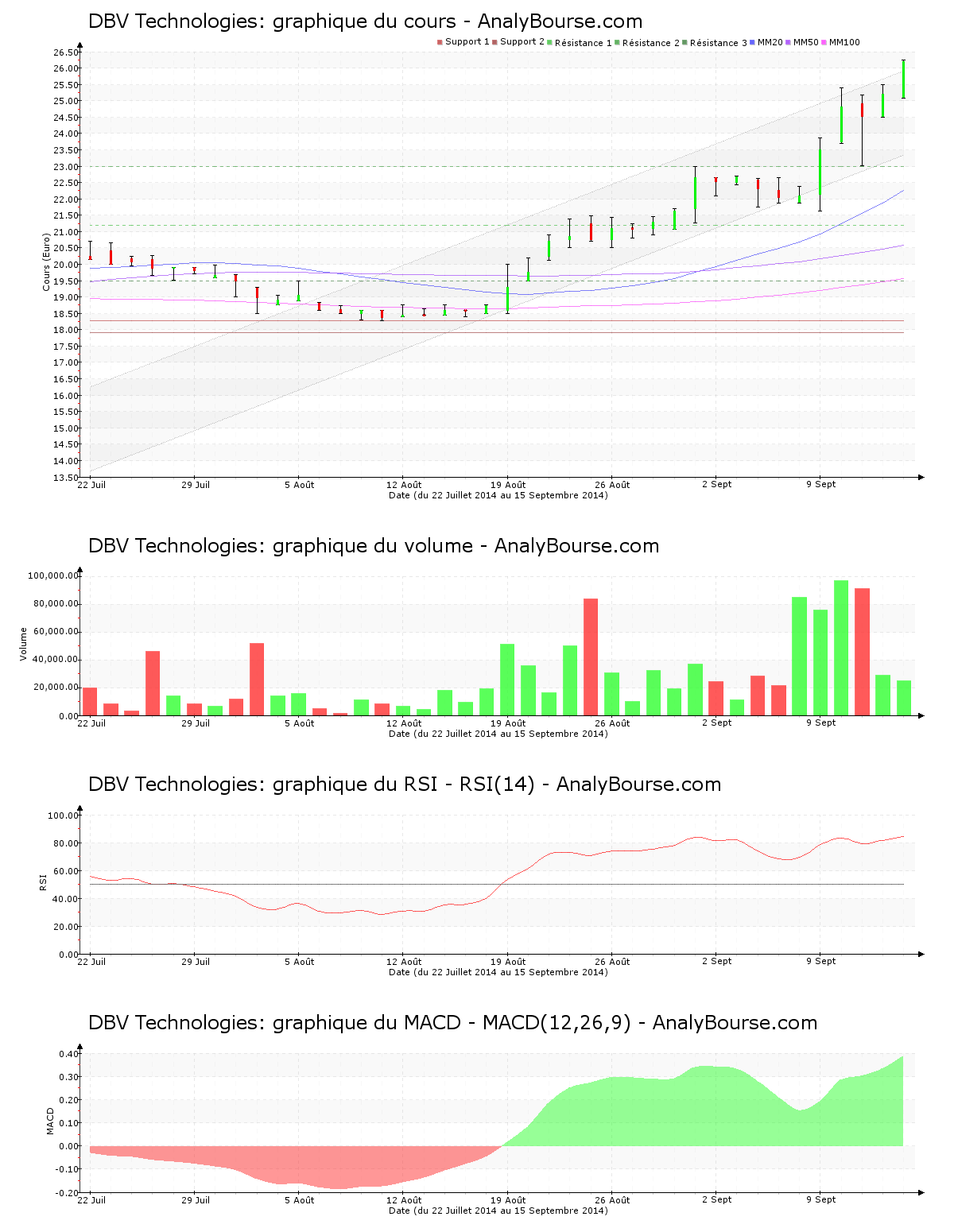L’action DBV Technologies affiche encore aujourd’hui une vigoureuse pression acheteuse, caractérisée par un cours croissant de 3.97%, avec 25000 titres échangés à 10:28. Cette dernière bondissait déjà vendredi dernier, avec un cours haussier de 2.73%. Démarrant à 25.200 € pour se rendre à 26.200 €, la valeur s’envole finalement de 1.000 €. On constate une sensible volatilité ce jour sur le cours, avec un taux de 4.67% séparant le maximum du minimum de DBV Technologies. La valeur se localise au-delà de son canal. Elle ne fluctue de fait plus ce lundi dans le canal à l’intérieur duquel cette dernière s’enclavait depuis quelques temps. La valeur a acquis 37.53%, depuis le mardi 5 août 2014, jour de son entrée dans le canal.