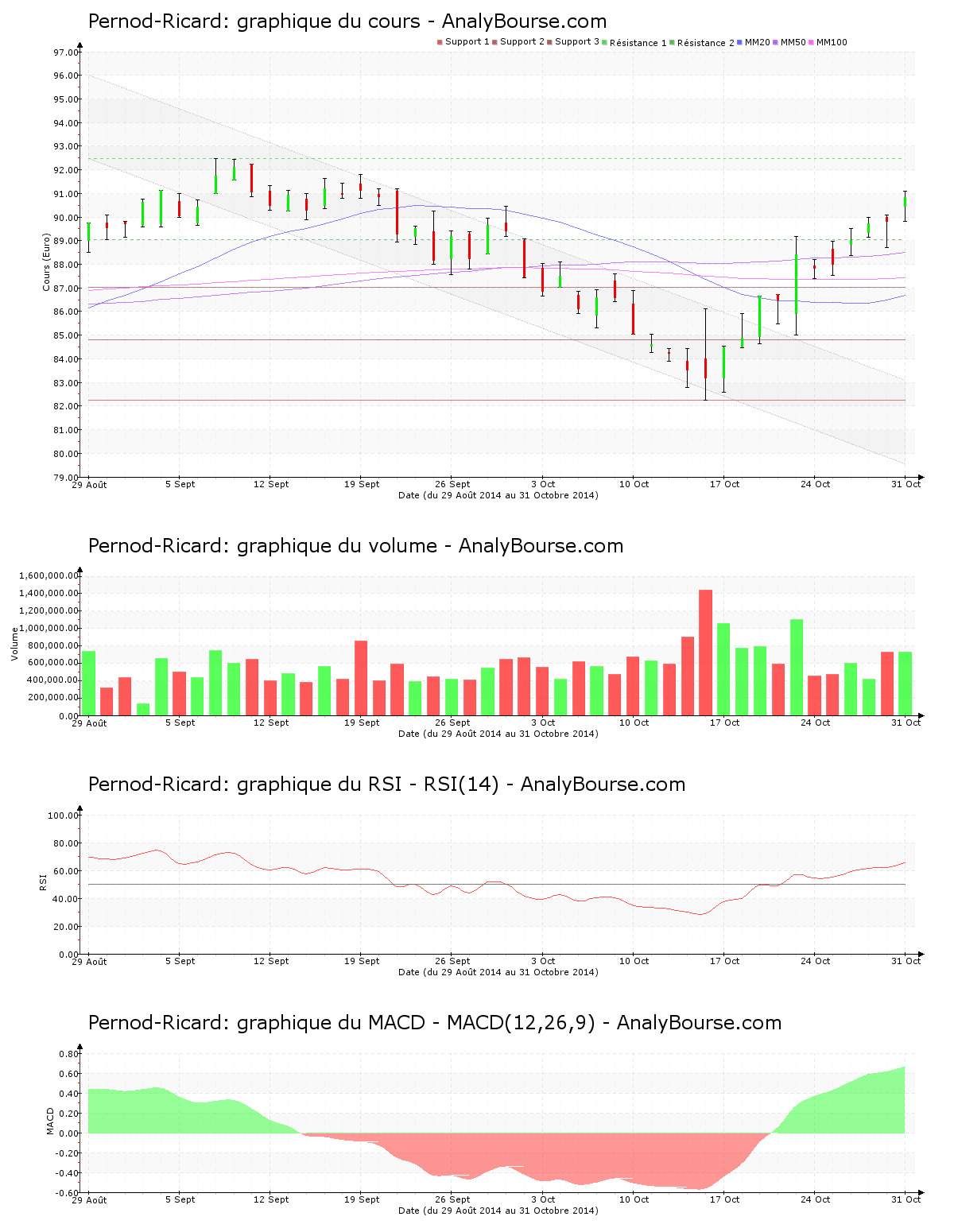 Soulignée par un cours croissant de 3.40%, la valeur Pernod-Ricard montre toujours cette semaine une pression acheteuse. Cette dernière croît maintenant de 2.990 €, commençant à 87.840 € pour atteindre 90.830 € ces derniers jours. Pernod-Ricard était en vigoureuse progression la semaine dernière, avec un cours croissant de 4.00%. L’évolution en hausse de la semaine dernière se ralentit ces cinq dernières séances de cotations. Le titre a dépassé la résistance des 89.030 € cette semaine. La résistance suivante se trouve à 92.480 €. La valeur est sortie par la limite supérieure du canal à l’intérieur duquel cette dernière cheminait depuis un certain temps. Désormais, cette dernière varie fortement au-delà de son canal.
