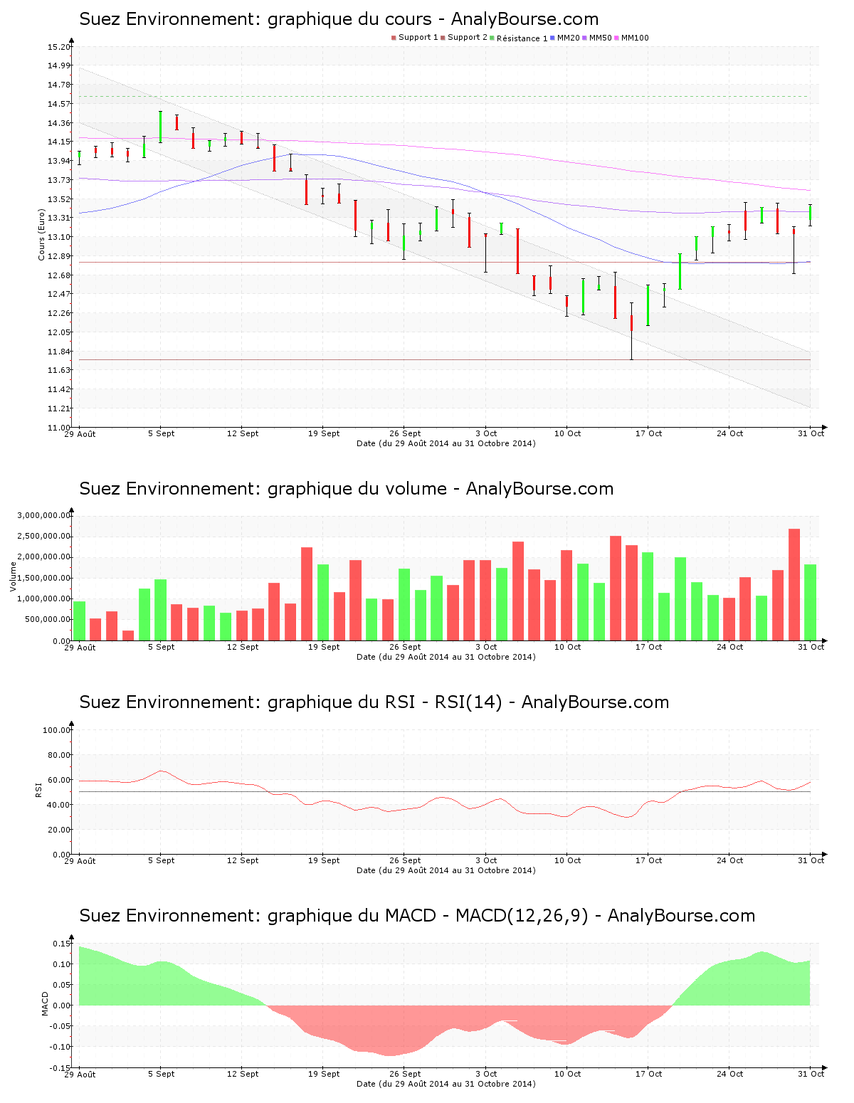 La valeur Suez Environnement connaît encore ces derniers jours une pression acheteuse, soulignée par un cours croissant de 2.21%. Débutant à 13.140 € pour accéder à 13.430 € ces derniers jours, cette dernière augmente maintenant de 0.290 €. Concrétisée par un cours croissant de 4.70%, la volonté d’achat sur Suez Environnement la semaine dernière était remarquablement substantielle. L’évolution croissante de la semaine dernière perd en ampleur cette semaine. Avec un pourcentage de 6.23% espaçant les extrêmes de Suez Environnement, on remarque une certaine instabilité ces dernières séances sur le cours. La valeur se place fortement au-dessus de son canal. Elle a de fait dépassé la zone supérieure du canal dans lequel cette dernière se délimitait depuis un certain temps.