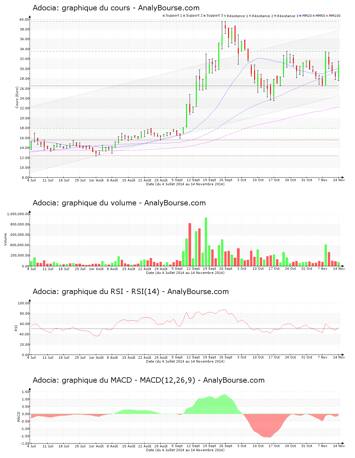L’indicateur RSI est ce jour en augmentation. Il est passé dans le niveau d’achat, ceci pourrait signaler un prémice d’une évolution croissante sur le long terme pour l’action Adocia. Le MACD est ce jour en ferme progression. Il représente néanmoins encore une tendance du titre en forte régression à moyen-court terme.