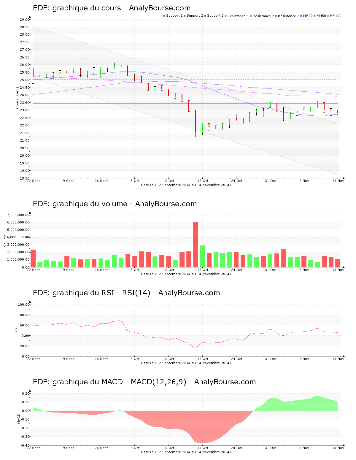 Le volume se trouve en-dessous de son niveau moyen sur un mois, de sensiblement deux million de titres échangés par jour. De fait, moins que les 1.7 million de la semaine dernière, avec une moyenne par jour de 1.1 million d’actions échangées, le volume est en décroissance cette semaine pour la valeur EDF. Ce volume en diminution suggère sur la valeur une régression de la spéculation.