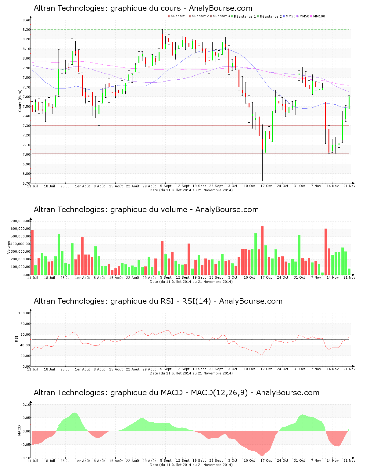 L’indicateur MACD est en progression ce jour. L’indicateur MACD a basculé en territoire positif ce vendredi 21 novembre, ceci pourrait signaler un commencement d’une évolution haussière à longue échéance pour l’action Altran Technologies.