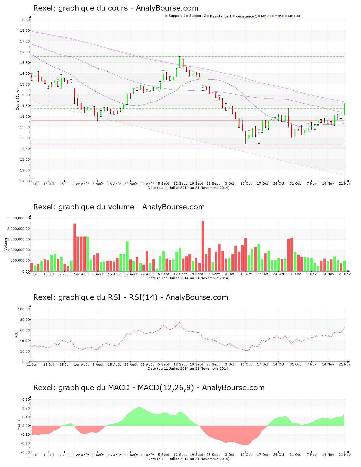 Le constat est encore franchement favorable ces cinq derniers jours pour l’action Rexel, avec un mouvement haussier de 5.85%. La valeur s’échange à présent à 14.560 €. Symbolisée par un cours haussier de 1.70%, elle montrait déjà la semaine dernière une pression acheteuse. Par conséquent, l’évolution haussière de la semaine dernière gagne en vitesse ces cinq dernières séances de cotations pour la valeur. Il s’agit de la première fois depuis le mercredi 1er octobre 2014 que l’action Rexel dépasse ce seuil. Le cours a franchi la résistance des 14.360 € cette semaine. La prochaine résistance se situe à 16.780 €. Enfin, Rexel fluctue cette semaine dans des limites de 8.05%, présentant une relative volatilité sur le cours. L’action se localise près de la limite supérieure du canal dans lequel cette dernière se limite depuis un certain temps.