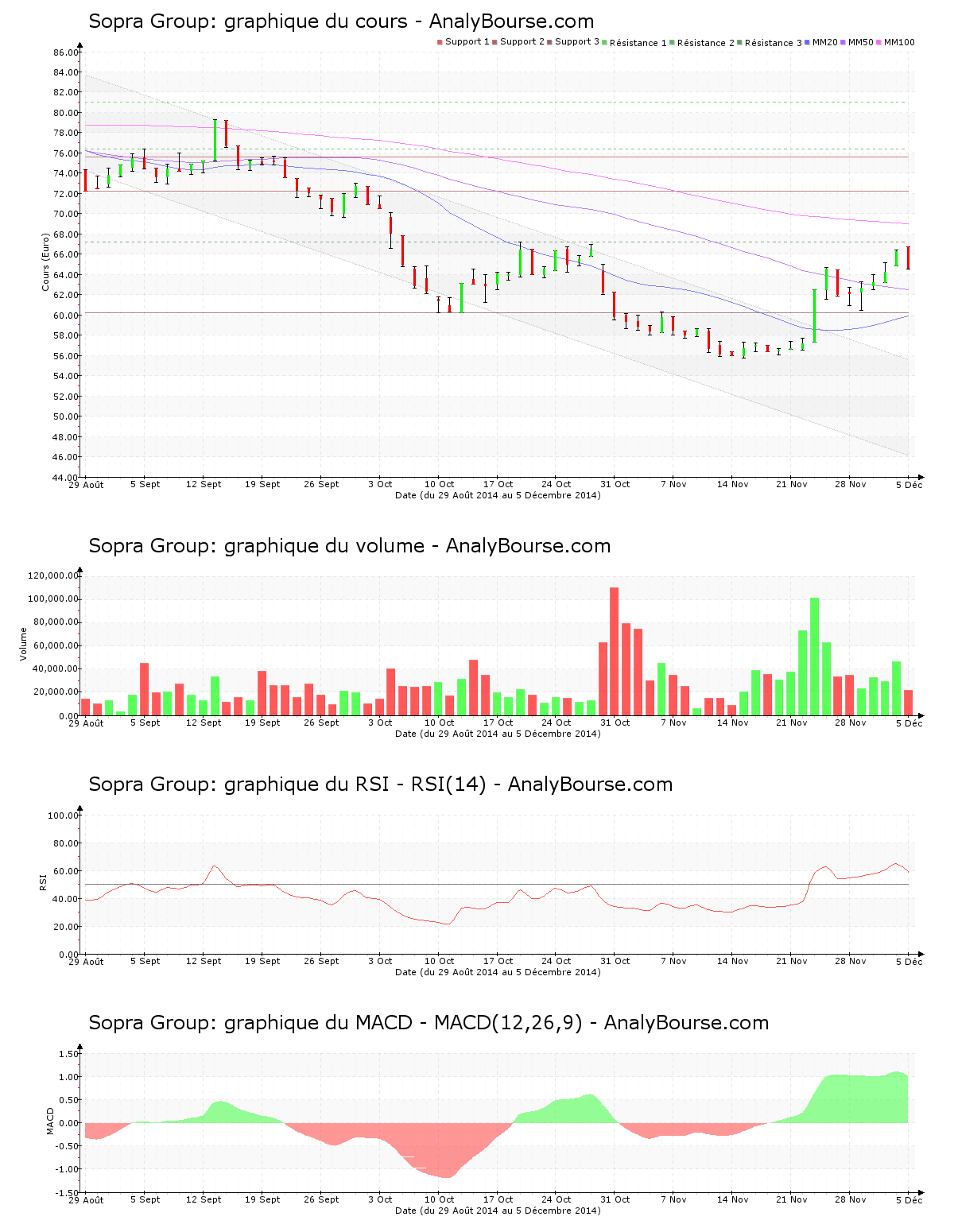 Imprégnée par un cours en diminution de 2.53%, la demande sur Sopra Group ce vendredi 5 décembre est extrêmement faible, avec un volume à 12:57 de 22000 actions échangées. La valeur s’apprécie maintenant à 64.600 €. Avec un comportement en ferme croissance de 3.16%, Sopra Group était par contre hier extrêmement entouré. La pression acheteurs/vendeurs se retourne ainsi fortement ce vendredi. Remarquons, avec un pourcentage de 3.44% séparant aujourd’hui le maximum du minimum, une relative agitation sur Sopra Group.