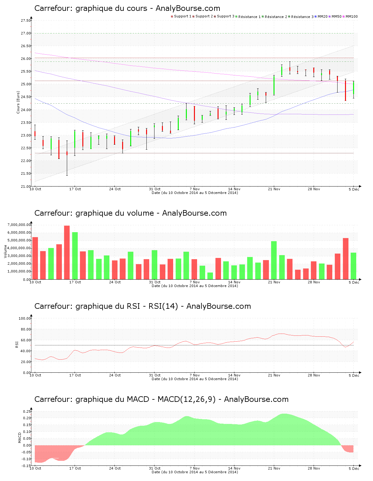 En ce qui concerne les indicateurs, le MACD est ces cinq derniers jours en vigoureuse décroissance. C’est à présent une trajectoire du cours en baisse qu’il dessine à court-moyen terme. Jeudi dernier, le MACD a basculé en terrain négatif, ce qui pourrait révèler un enclenchement d’une trajectoire en régression à longue échéance pour Carrefour. De son côté, on remarque que le RSI est en décroissance ces derniers jours. C’est malgré tout toujours dans le niveau d’achat qu’il se positionne.