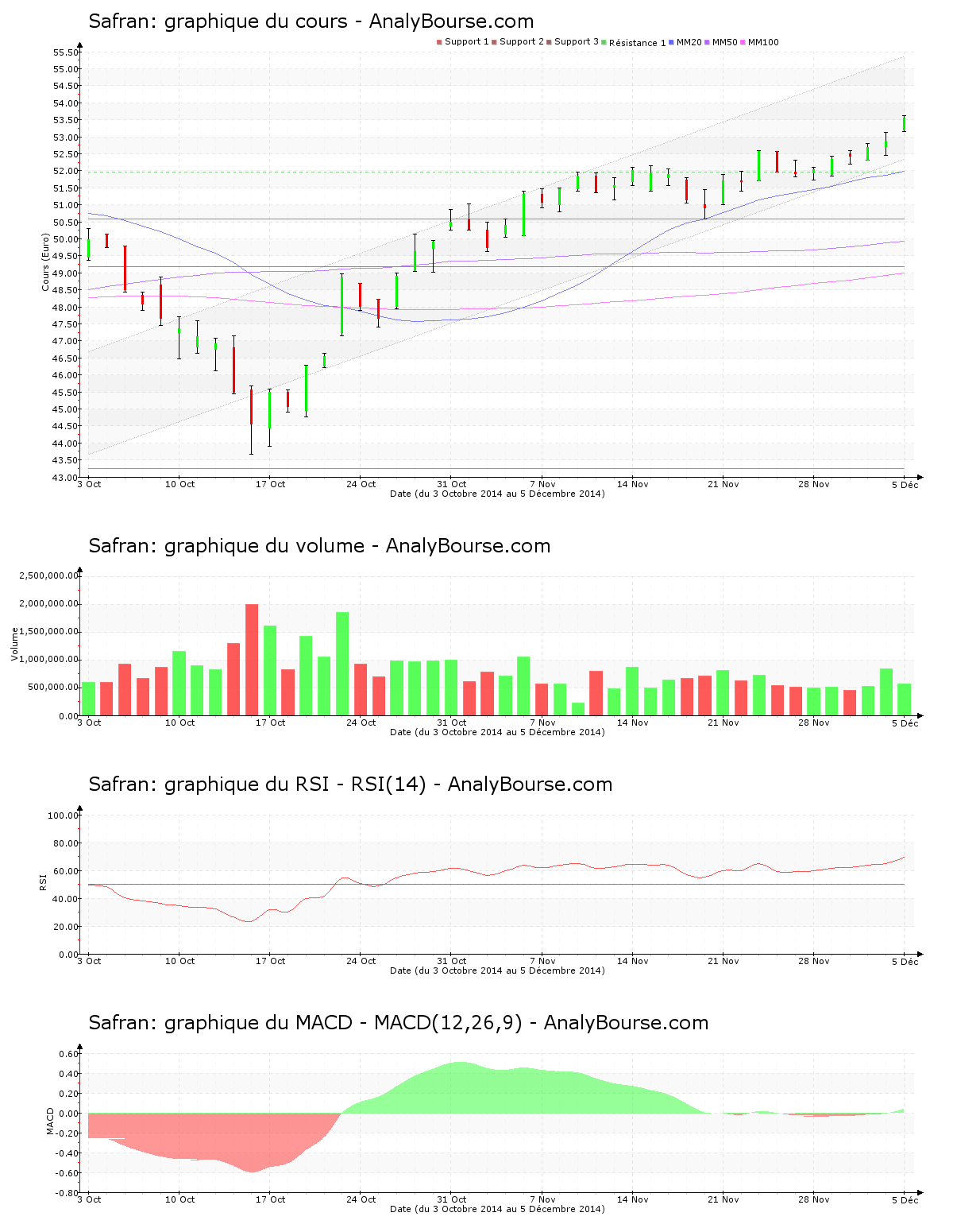 En ce qui concerne les indicateurs, la moyenne mobile sur 20 jours de la valeur Safran se trouve au-delà de la moyenne mobile sur 50 jours, et la moyenne mobile sur 50 jours se place quant à elle au-delà de la moyenne mobile sur 100 jours. Sur le long terme, le comportement de l’action est ainsi en hausse. Depuis désormais 49 jours, la moyenne mobile sur 50 jours de la valeur Safran se trouve au-dessus de sa moyenne mobile sur 100 jours. De son côté, concernant l’indicateur RSI, on repère que ce dernier est assez stable cette semaine. C’est par conséquent encore dans le niveau d’achat que ce dernier se localise. Pour terminer, concernant le MACD, on note que ce dernier est en forte progression ces derniers jours. C’est maintenant une trajectoire du titre en progression que ce dernier caractérise sur le moyen terme. Jeudi dernier, l’indicateur MACD a basculé du côté positif, cela pourrait révèler une amorce d’une évolution haussière à long terme pour Safran.