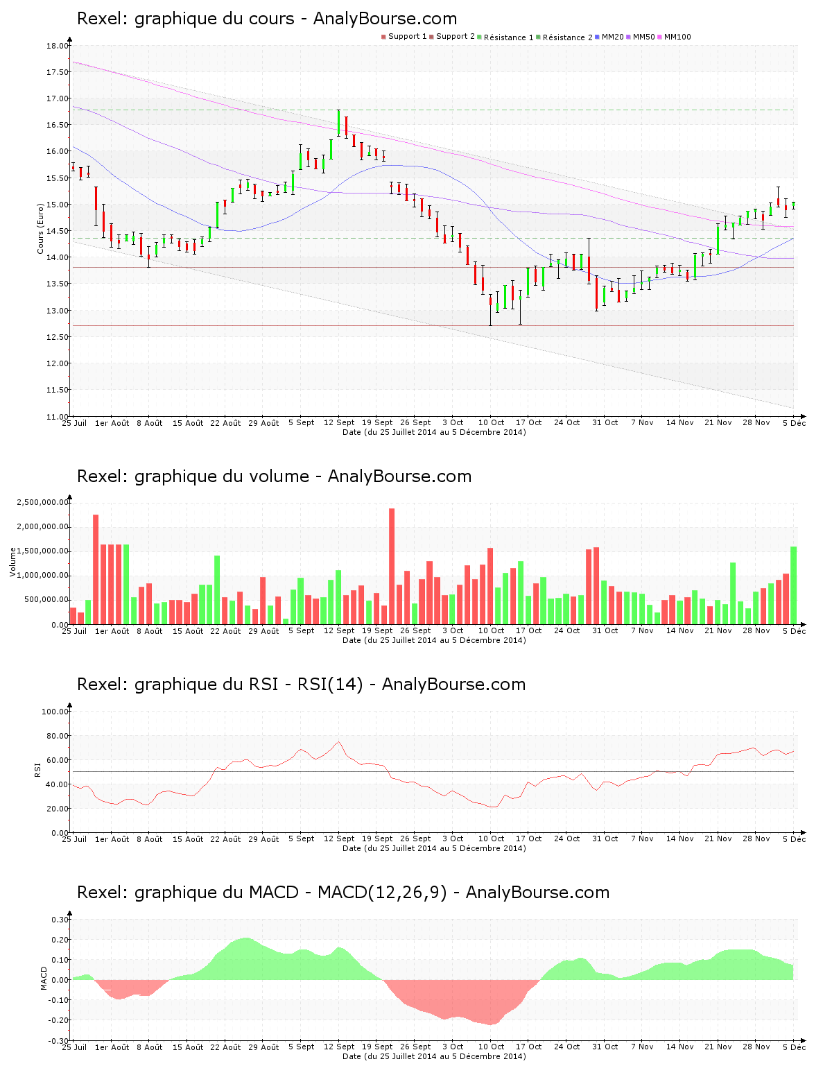 Ces informations constituent une analyse technique de l’action Rexel au dimanche 7 décembre 2014. Cette analyse peut être invalidée par des éléments plus récents, et ne constitue en aucune manière une incitation d’achat ou de vente sur les marchés financiers. Le lecteur reste libre et responsable de l’interprétation et de l’usage faits de ces informations.