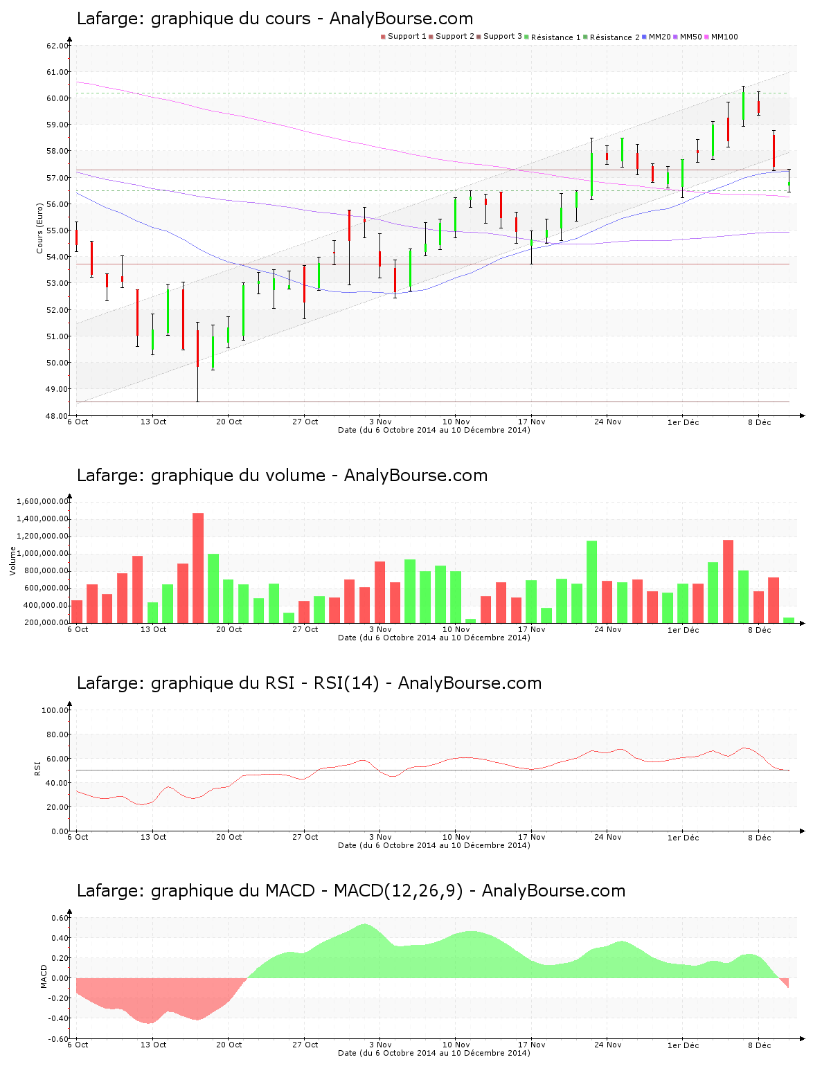 L’indicateur MACD est en solide décroissance ce mercredi. Ce mercredi, le MACD a basculé en territoire négatif, ce qui pourrait suggérer un amorcement d’une trajectoire décroissante pour l’action Lafarge à long terme. L’indicateur RSI est ce mercredi en baisse. Il a basculé dans le niveau de vente, cela peut révèler une ébauche de tendance baissière pour la valeur Lafarge à long terme.