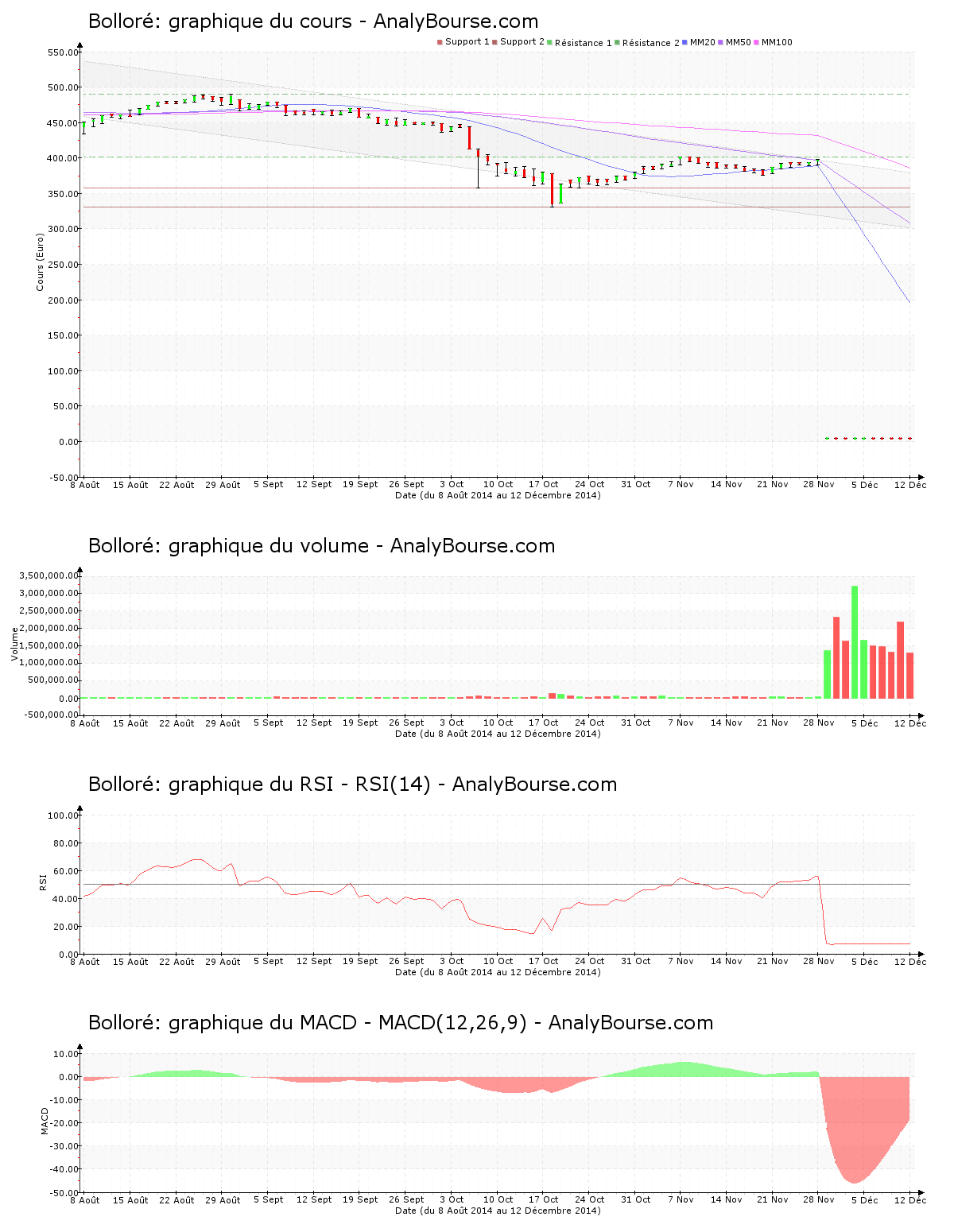 Ces informations constituent une analyse technique de l’action Bolloré au dimanche 14 décembre 2014. Cette analyse peut être invalidée par des éléments plus récents, et ne constitue en aucune manière une incitation d’achat ou de vente sur les marchés financiers. Le lecteur reste libre et responsable de l’interprétation et de l’usage faits de ces informations.