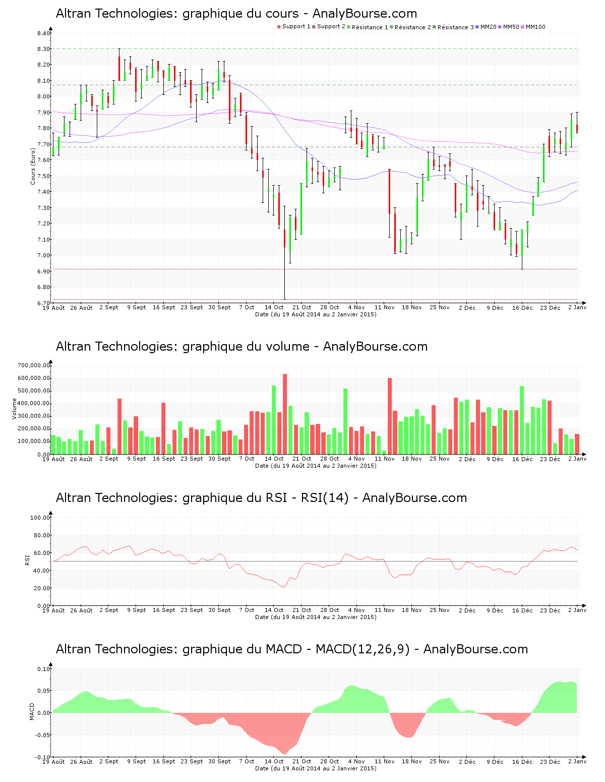 En ce qui concerne les indicateurs, le MACD est ces cinq dernières séances de cotations plutôt stable. Ce dernier indique donc toujours une évolution du titre en forte hausse à court-moyen terme. Ensuite, on relève que l’indicateur RSI est plutôt stable ces cinq dernières séances de cotations. C’est ainsi toujours dans le niveau d’achat que ce dernier se situe. La moyenne mobile sur vingt jours de l’action Altran Technologies se localise en deçà de la moyenne mobile sur cinquante jours, qui se trouve quant à elle en deçà de la moyenne mobile sur cent jours. Sur le long terme, le mouvement de l’action est ainsi en diminution. Depuis finalement 55 séances, la moyenne mobile sur vingt jours de la valeur Altran Technologies se place en deçà de sa moyenne mobile sur cinquante jours.