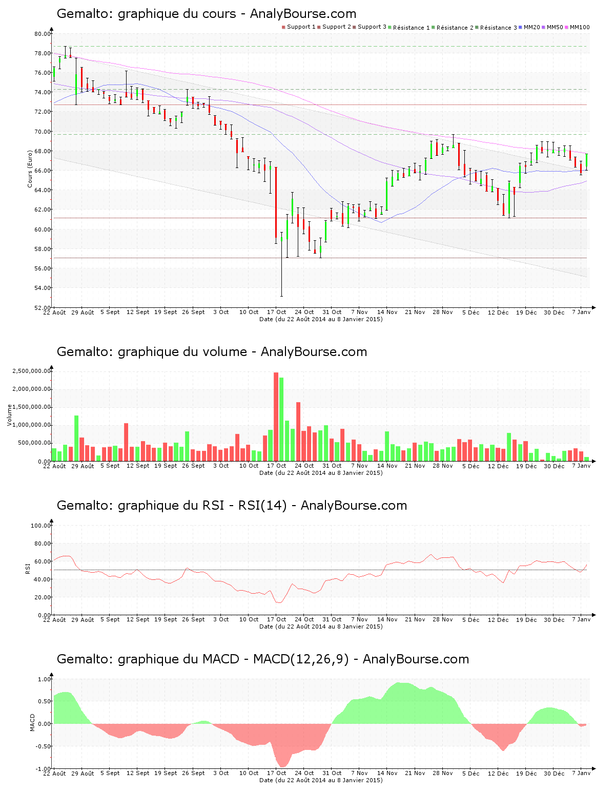 Concernant le RSI, on relève que ce dernier est en hausse ce jeudi. Il est passé au niveau d’achat, ce qui peut dessiner un démarrage de tendance croissante à long terme pour la valeur Gemalto.