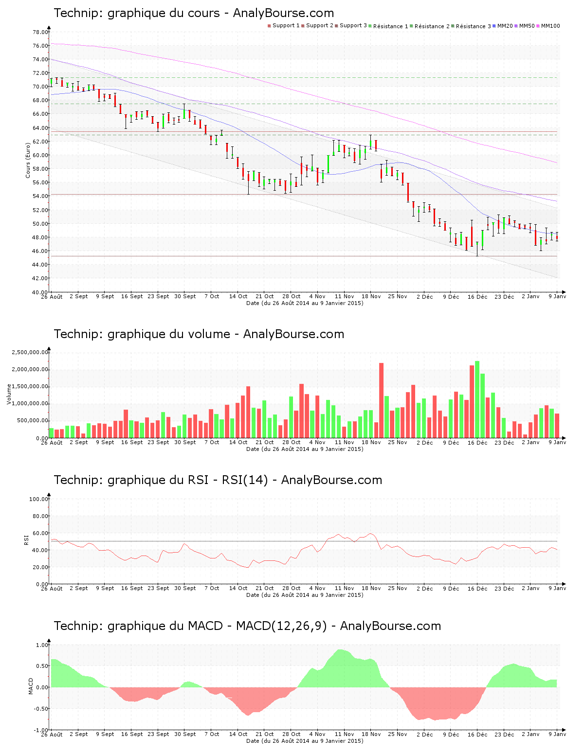 Côté indicateurs, le MACD est ces cinq dernières séances de cotations en conséquente baisse. Il caractérise malgré ceci encore une tendance du titre en conséquente progression sur le moyen terme. Ensuite, la moyenne mobile sur 20 jours de la valeur Technip se situe en deçà de la moyenne mobile sur 50 jours, et la moyenne mobile sur 50 jours se localise quant à elle en deçà de la moyenne mobile sur 100 jours. Sur la durée, l’action présente ainsi un parcours décroissant. Enfin, on remarque que l’indicateur RSI est plutôt stable ces cinq dernières séances. Ce dernier se localise donc encore au niveau de vente.