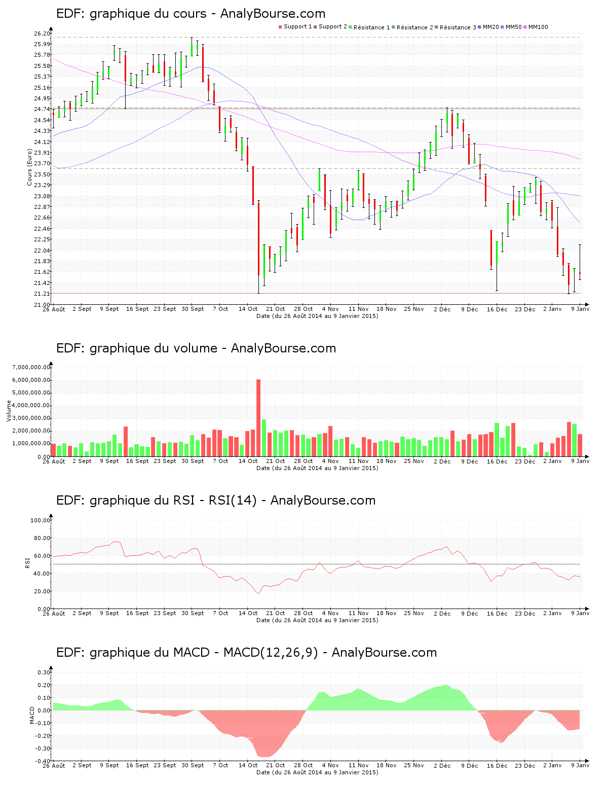 |La valeur EDF n’a pas passé ce seuil depuis plus de 57 séances. Le mouvement baissier de la semaine dernière prend de la vitesse ces cinq dernières séances de cotations pour la valeur EDF. Avec un cours décroissant de 4.51%, elle s’écroule cette semaine. La valeur se revend finalement à 21.590 €. Avec un développement baissier de 2.71%, le constat était déjà négatif la semaine dernière pour EDF. EDF se développe ces cinq derniers jours de cotations dans un range de 7.78%, ce qui indique une certaine fébrilité sur le cours. Le mouvement du titre l’entraîne dorénavant à proximité du support des 21.210 €.