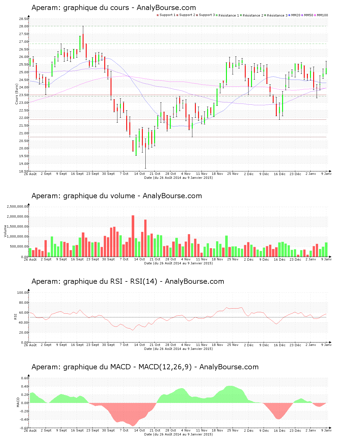 On note que ces dernières séances l’indicateur RSI est relativement stable. C’est ainsi encore dans le niveau d’achat qu’il se positionne. La moyenne mobile sur cinquante jours de l’action Aperam se trouve au-delà de sa moyenne mobile sur cent jours depuis jeudi dernier. La moyenne mobile sur vingt jours de la valeur Aperam se trouve au-delà de la moyenne mobile sur cinquante jours, et la moyenne mobile sur cinquante jours se situe pour sa part au-delà de la moyenne mobile sur cent jours. Sur la durée, le parcours de la valeur est ainsi en hausse. La moyenne mobile sur vingt jours de l’action Aperam se place dorénavant au-dessus de sa moyenne mobile sur cinquante jours depuis 31 jours de cotations. Pour terminer, on remarque que l’indicateur MACD est en diminution ces cinq dernières séances de cotations. C’est à présent une trajectoire du titre relativement stable qu’il signale sur le moyen terme.