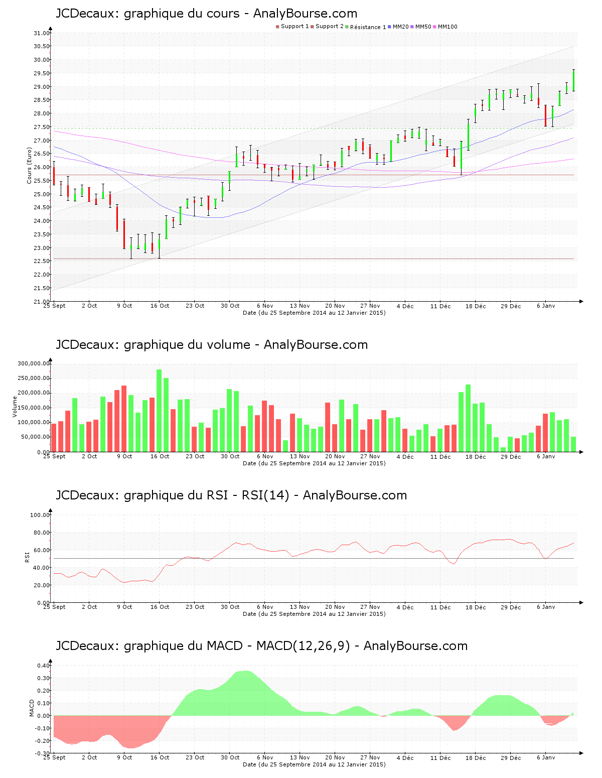 Pour les indicateurs, on observe que ce jour l’indicateur MACD est en importante hausse. Le MACD a basculé en secteur positif aujourd’hui, ce qui peut esquisser un engagement de tendance en croissance sur le long terme pour la valeur JCDecaux.