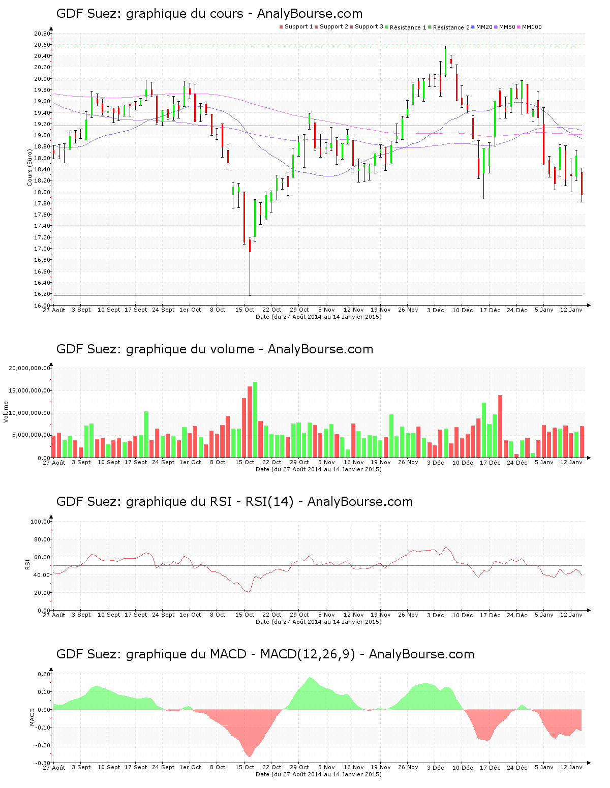 GDF Suez se déprécie sur une semaine de cotations, avec un mouvement baissier de 1.05%. Le titre se dévalorise de manière similaire en un mois, avec un développement baissier de 7.71%. GDF Suez est néanmoins en progression sur un an, avec un cours en progression de 6.31%.