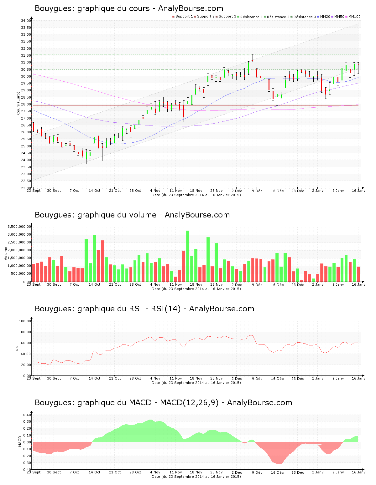 En ce qui concerne les indicateurs, on remarque que l’indicateur RSI est stable cette semaine. Il se place par conséquent encore au niveau d’achat. Pour sa part, pour le MACD, on observe qu’il est en substantielle croissance ces derniers jours. Il esquisse maintenant une tendance du titre en substantielle hausse à moyen-court terme. L’indicateur MACD a basculé en territoire positif mardi dernier, cela peut caractériser un prélude d’une orientation croissante sur le long terme pour Bouygues. Enfin, la moyenne mobile sur 20 jours de l’action Bouygues se trouve au-delà de la moyenne mobile sur 50 jours, et la moyenne mobile sur 50 jours se situe quant à elle au-delà de la moyenne mobile sur 100 jours. L’action traduit ainsi un parcours en augmentation à longue échéance. La moyenne mobile sur 20 jours de la valeur Bouygues se situe maintenant au-dessus de sa moyenne mobile sur 50 jours depuis 47 séances.