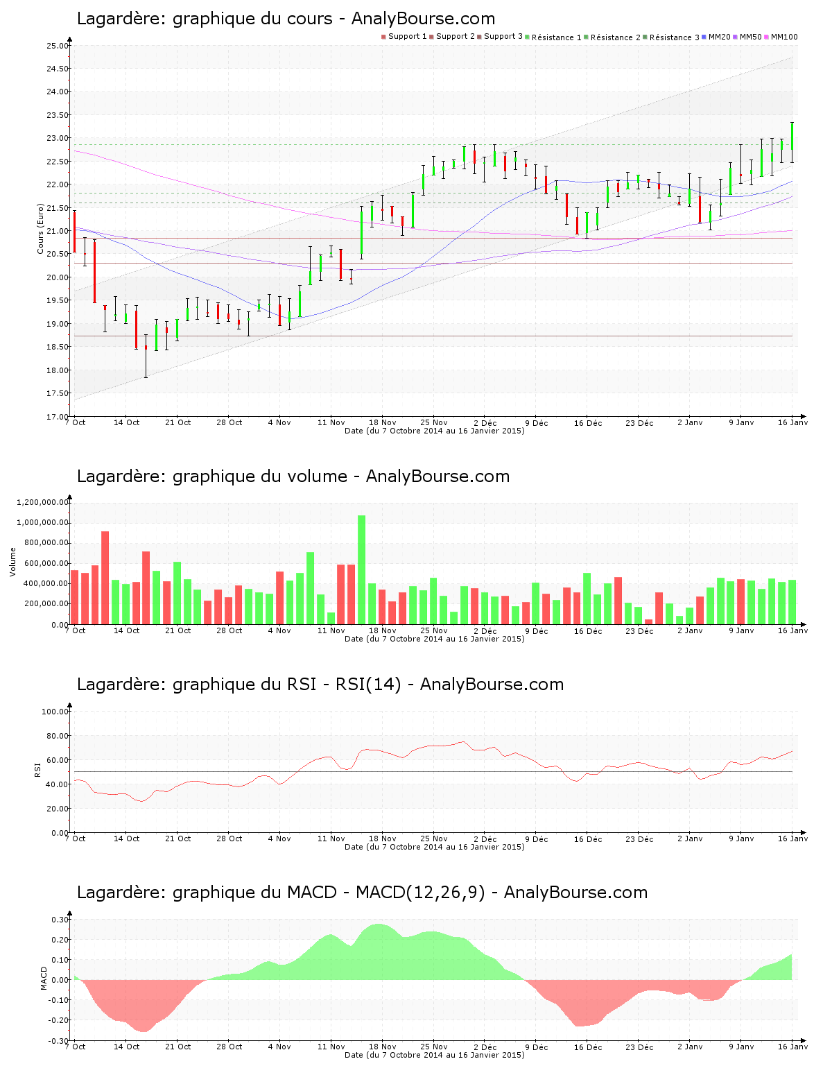 Pour les indicateurs, la moyenne mobile sur vingt jours de la valeur Lagardère est positionnée au-dessus de sa moyenne mobile sur cinquante jours, qui est pour sa part positionnée au-delà de sa moyenne mobile sur cent jours. Le mouvement de l’action est donc en hausse à long terme. Depuis désormais 37 séances de cotations, la moyenne mobile sur vingt jours de la valeur Lagardère se trouve au-delà de sa moyenne mobile sur cinquante jours. Pour l’indicateur RSI, on relève que ce dernier est en progression ces cinq dernières séances de cotations. Ce dernier se situe finalement au niveau d’achat. Pour terminer, l’indicateur MACD est ces cinq dernières séances en grande augmentation. C’est finalement une trajectoire du titre en vigoureuse croissance que ce dernier montre sur le court-moyen terme. Lundi dernier, l’indicateur MACD est passé du côté positif, ceci pourrait ébaucher un engagement d’une orientation croissante sur le long terme pour Lagardère.