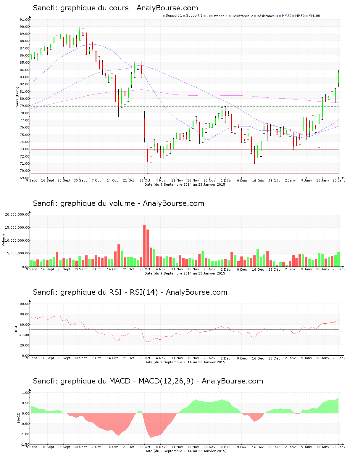 |Avec un développement haussier de 4.57%, la valeur Sanofi est toujours en conséquente augmentation ces cinq dernières séances de cotations. L’action explose à présent de 3.650 €, allant de 79.930 € à 83.580 € ces derniers jours. Cette dernière affichait déjà la semaine dernière une forte pression acheteuse, reflétée par un cours croissant de 6.74%. Quantifiée par un cours haussier de 11.62% sur deux semaines de cotations, la demande sur le cours de Sanofi ces deux dernières semaines est par conséquent très vigoureuse. L’action Sanofi s’apprécie à son montant du lundi 27 octobre 2014. Le parcours du cours le conduit finalement proche de la résistance des 85.180 €. Sanofi présente une relative volatilité cette semaine, le titre fluctuant dans des limites de 6.48%.