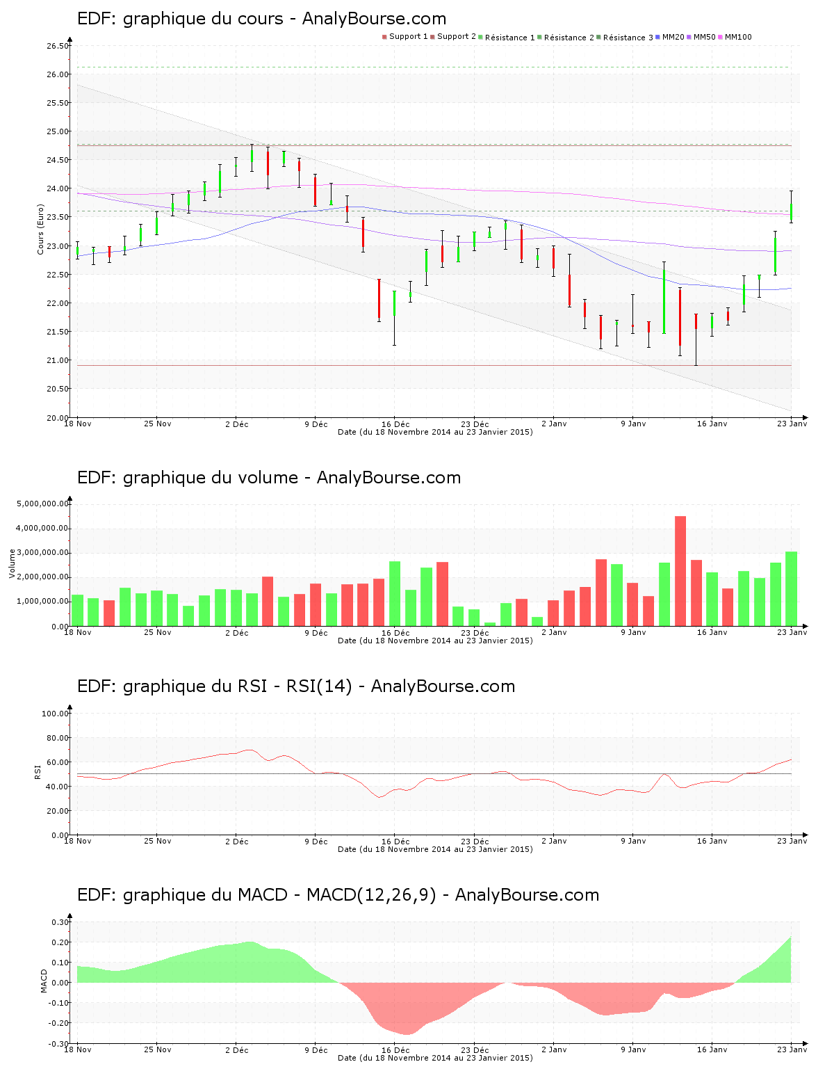 Côté indicateurs, en ce qui concerne l’indicateur MACD, on relève que ce dernier est en forte augmentation ces dernières séances. Il signale à présent une tendance du titre en vigoureuse progression à court-moyen terme. L’indicateur MACD a basculé en terrain positif mardi dernier, cela pourrait caractériser un prélude de tendance croissante à longue échéance pour EDF. Ensuite, la moyenne mobile sur 20 jours de l’action EDF se localise en deçà de la moyenne mobile sur 50 jours, qui se situe quant à elle en deçà de la moyenne mobile sur 100 jours. La valeur affiche donc un parcours baissier sur la durée. Voilà à présent 45 jours que la moyenne mobile sur 50 jours de l’action EDF se positionne en-dessous de sa moyenne mobile sur 100 jours. Enfin, on constate que l’indicateur RSI est en hausse ces cinq derniers jours de cotations. Ce dernier se situe maintenant au niveau d’achat.