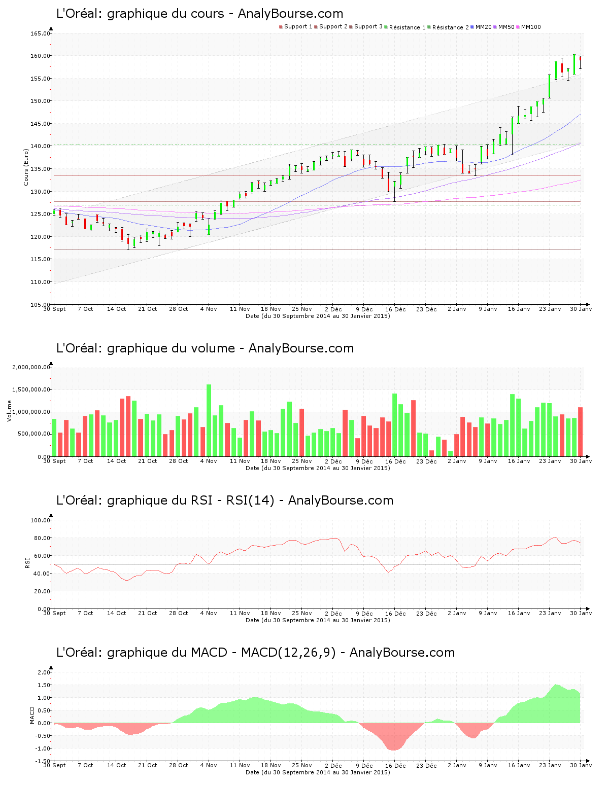 Avec un cours haussier de 2.18%, l’action L’Oréal augmente encore ces derniers jours. Elle atteint désormais 159.050 €. Animée par un comportement haussier de 6.14%, L’Oréal montrait la semaine dernière une grande pression acheteuse. L’évolution en hausse de la semaine dernière perd en ampleur ces cinq derniers jours. L’action a franchi la zone supérieure du canal à l’intérieur duquel elle se délimitait ces dernières semaines. Maintenant, cette dernière varie sérieusement au-delà de son canal. L’action a augmenté de 33.38%, depuis que cette dernière est entrée dans le canal le mercredi 8 octobre 2014.