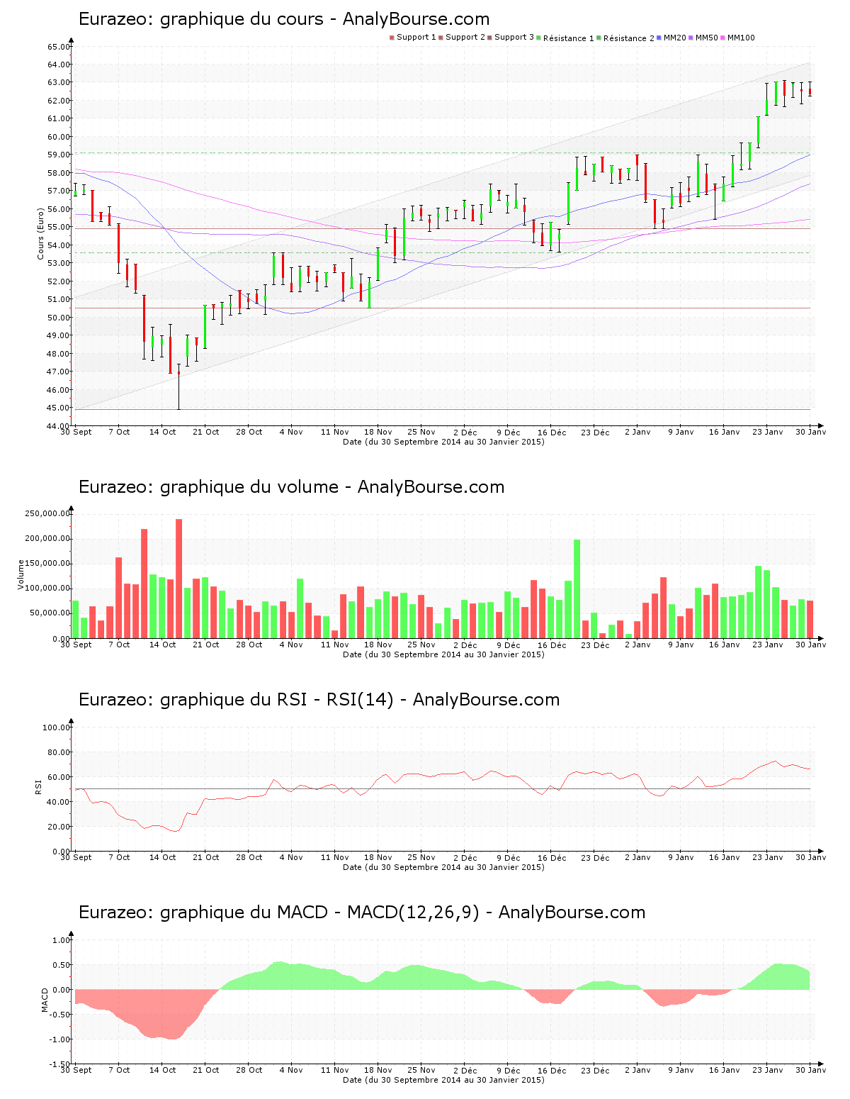 Du côté des indicateurs, on repère que le MACD est en régression ces cinq derniers jours de cotations. Ce dernier dévoile toutefois encore une tendance du cours en solide hausse sur le moyen-court terme. Ensuite, pour le RSI, on remarque que ce dernier est relativement stable ces cinq derniers jours de cotations. Il se situe ainsi encore dans le niveau d’achat. La moyenne mobile sur vingt jours de la valeur Eurazeo est positionnée au-delà de sa moyenne mobile sur cinquante jours, qui est pour sa part localisée au-dessus de sa moyenne mobile sur cent jours. A longue échéance, l’action traduit ainsi un cours haussier. Voici maintenant 45 jours de cotations que la moyenne mobile sur vingt jours de l’action Eurazeo se trouve au-dessus de sa moyenne mobile sur cinquante jours.