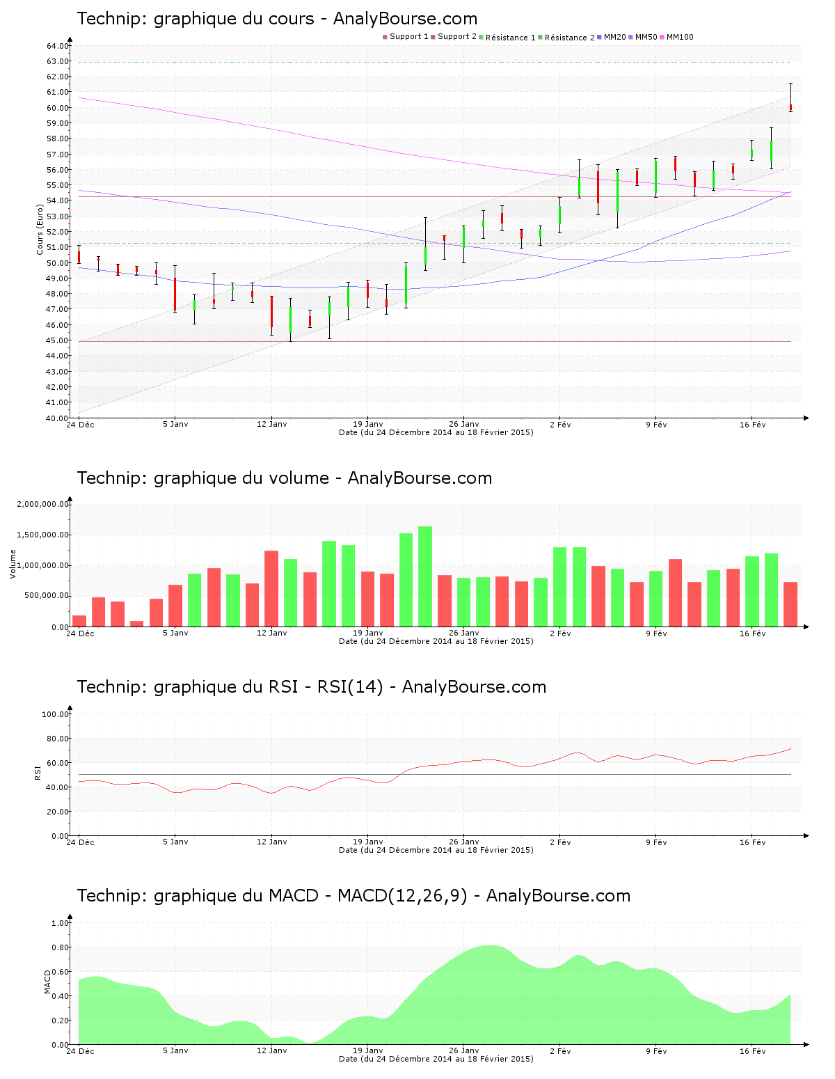 Le mouvement haussier prend de l’ampleur ce jour pour la valeur Technip, avec un volume à 10:27 de 723000 actions échangées. Le bilan est remarquablement encourageant pour l’action, avec un cours en augmentation de 3.64%. L’action s’envole dorénavant de 2.100 €, passant de 57.770 € à 59.870 € aujourd’hui. Le parcours était déjà favorable hier pour Technip, avec un cours haussier de 0.87%. La valeur Technip n’avait pas franchi ce niveau depuis pas moins de 61 séances de cotations. Le cours naviguant dans un range de 3.10%, Technip enregistre une sensible agitation ce jour. Technip amorçant la journée à 60.150 €, on observe également sur le cours la présence d’un gap haussier de 4.12% à l’ouverture de la cotation.