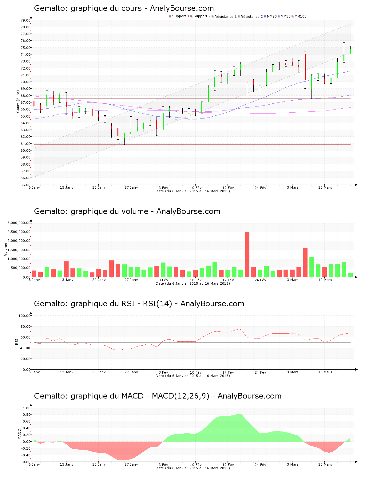 On relève que le MACD est en vigoureuse croissance ce lundi 16 mars. Le MACD a basculé en secteur positif aujourd’hui, ce qui pourrait dessiner un prélude d’une évolution en augmentation à long terme pour l’action Gemalto.