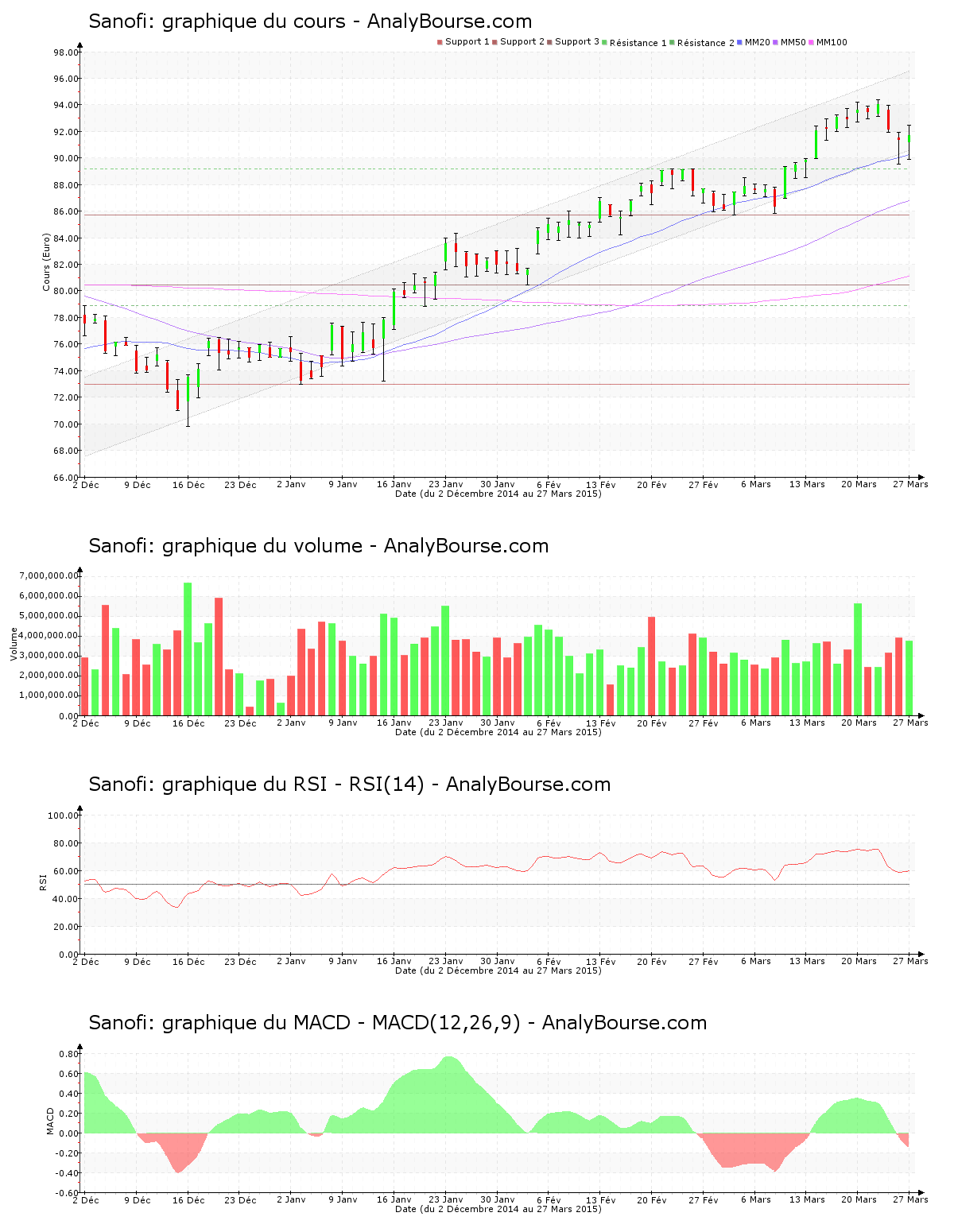 |Avec un développement en baisse de 2.07%, Sanofi est ces cinq dernières séances attaqué. La valeur se revend dorénavant à 91.690 €. Sanofi supportait à l’inverse la semaine dernière une importante pression acheteuse, reflétée par un cours en hausse de 4.23%. La tendance s’inverse donc fortement ces dernières séances. Avec un pourcentage de 5.44% qui espace le plus haut du plus bas de Sanofi, on note une relative instabilité ces cinq dernières séances de cotations sur le titre. L’action se positionne au niveau inférieur du canal dans lequel elle fluctue depuis quelques semaines.