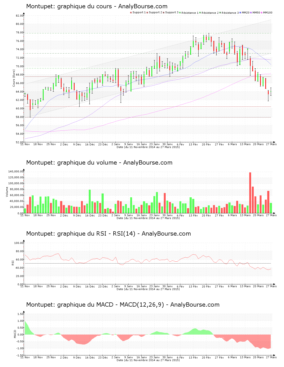 Du côté des indicateurs, l’indicateur MACD est en vigoureuse diminution ces derniers jours. Ce dernier représente désormais une tendance du titre en substantielle décroissance sur le court-moyen terme. Le RSI est stable ces cinq dernières séances de cotations. Il se trouve par conséquent encore dans le niveau de vente. La moyenne mobile sur vingt jours de la valeur Montupet a croisé la moyenne mobile sur cinquante jours mardi dernier. La moyenne mobile sur cinquante jours de l’action Montupet se localise désormais au-delà de sa moyenne mobile sur cent jours depuis 86 jours de cotations.