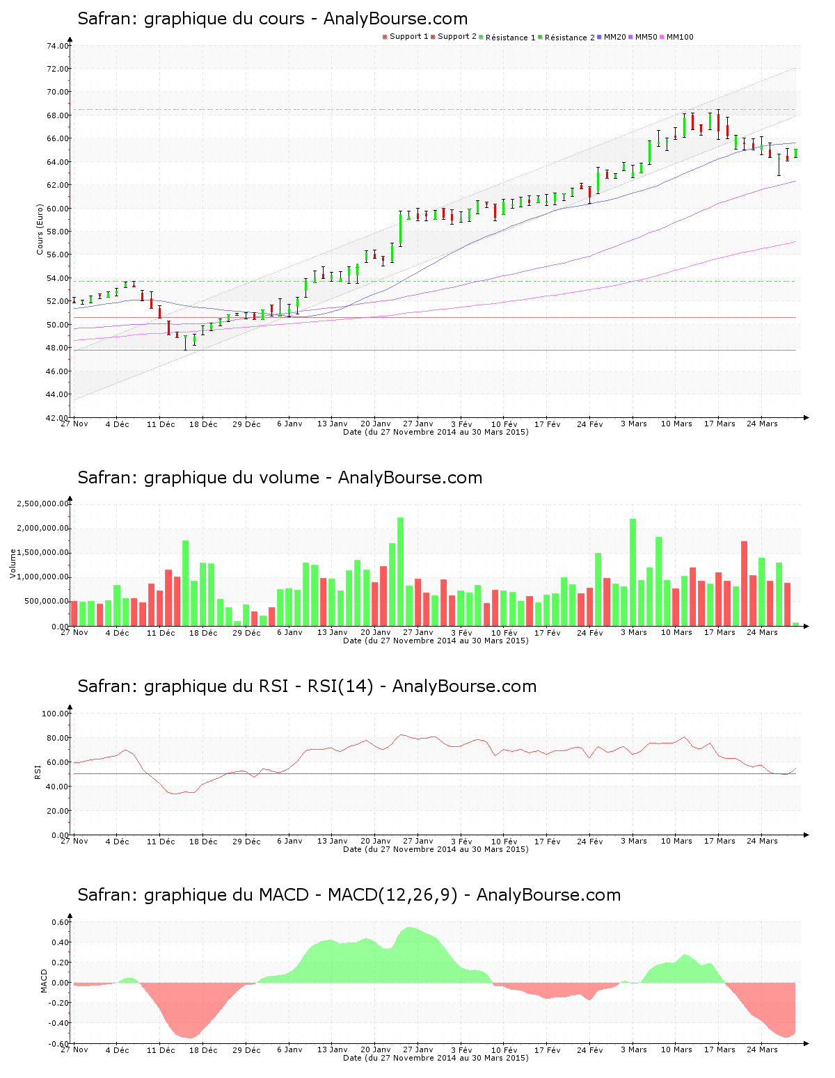 En ce qui concerne les indicateurs, on constate que ce jour le MACD est en vigoureuse hausse. C’est malgré tout toujours une tendance du cours en solide décroissance que ce dernier montre sur le court-moyen terme. On repère que l’indicateur RSI est en hausse aujourd’hui. Il a basculé dans le niveau d’achat, cela peut caractériser un amorcement d’une orientation haussière à longue échéance pour la valeur Safran.