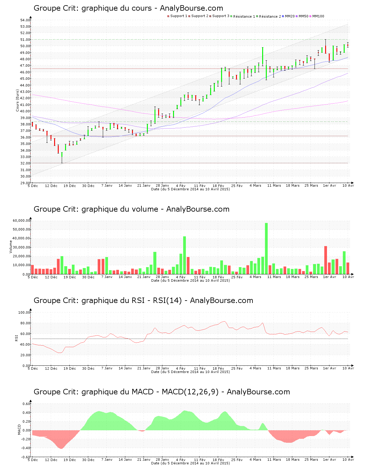 En ce qui concerne les indicateurs, pour l’indicateur MACD, on relève que ce dernier est en conséquente progression cette semaine. Il révèle à présent une évolution du cours assez stable à court-moyen terme. L’indicateur MACD a basculé en territoire positif hier, cela peut indiquer un enclenchement de tendance croissante sur une longue période pour Groupe Crit. Ensuite, la moyenne mobile sur vingt jours de la valeur Groupe Crit se place au-delà de la moyenne mobile sur cinquante jours, qui se localise pour sa part au-dessus de la moyenne mobile sur cent jours. Le développement de l’action est donc en progression à longue échéance. La moyenne mobile sur vingt jours de l’action Groupe Crit se trouve dorénavant au-dessus de sa moyenne mobile sur cinquante jours depuis 53 séances de cotations. Pour finir, le RSI est cette semaine relativement stable. C’est par conséquent toujours au niveau d’achat qu’il se positionne.