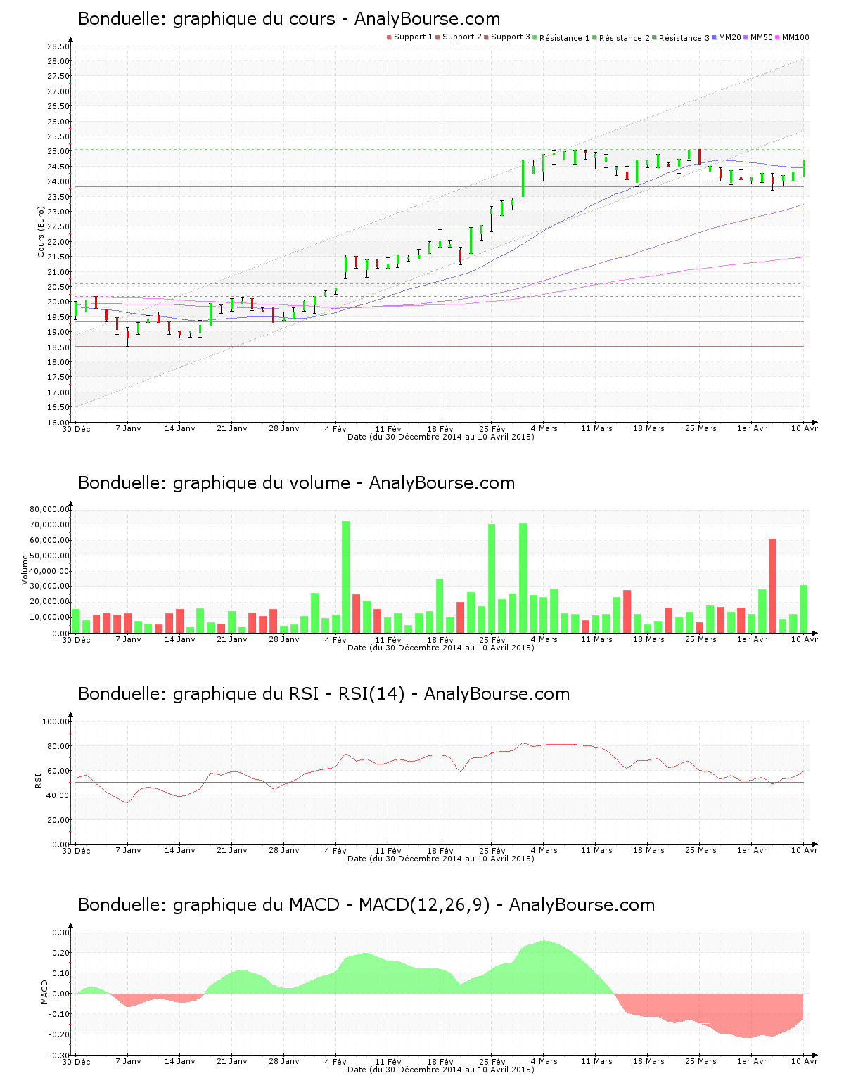 Côté indicateurs, l’indicateur MACD est en ferme progression ces cinq derniers jours. C’est néanmoins encore une tendance du titre en importante diminution qu’il esquisse sur le court-moyen terme. De son côté, l’indicateur RSI est ces dernières séances relativement stable. Il se trouve donc encore dans le niveau d’achat. Pour finir, la moyenne mobile sur vingt jours de la valeur Bonduelle se trouve au-dessus de la moyenne mobile sur cinquante jours, qui se localise quant à elle au-dessus de la moyenne mobile sur cent jours. Sur le long terme, la valeur révèle ainsi un cours croissant. Depuis à présent 44 séances de cotations, la moyenne mobile sur vingt jours de la valeur Bonduelle se situe au-delà de sa moyenne mobile sur cinquante jours.