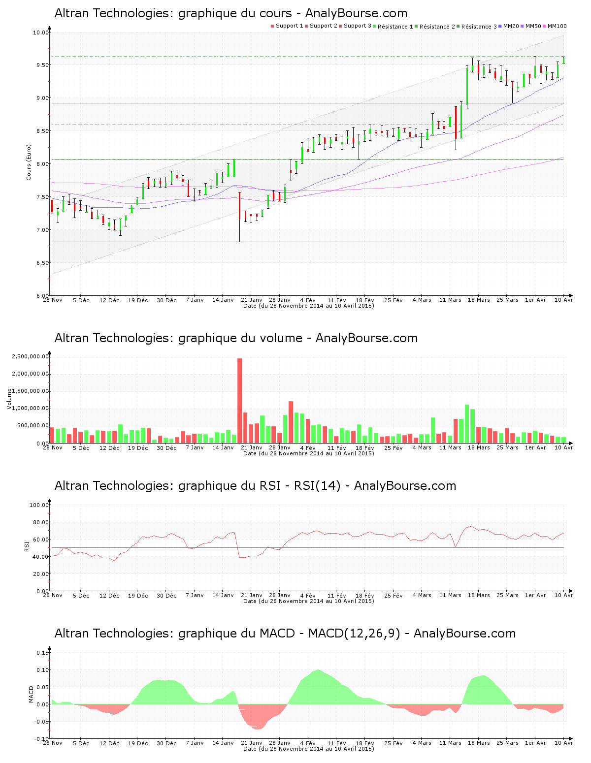 Côté indicateurs, l’indicateur MACD est ces cinq dernières séances de cotations assez stable. C’est ainsi encore une trajectoire du titre plutôt stable qu’il montre sur le moyen terme. De son côté, la moyenne mobile sur 20 jours de l’action Altran Technologies se positionne au-delà de la moyenne mobile sur 50 jours, et la moyenne mobile sur 50 jours se positionne elle-même au-delà de la moyenne mobile sur 100 jours. L’action enregistre donc un développement haussier à long terme. La moyenne mobile sur 20 jours de l’action Altran Technologies se positionne maintenant au-delà de sa moyenne mobile sur 50 jours depuis 64 jours. Pour finir, on note que ces cinq derniers jours de cotations l’indicateur RSI est assez stable. C’est par conséquent toujours dans le niveau d’achat que ce dernier se localise.