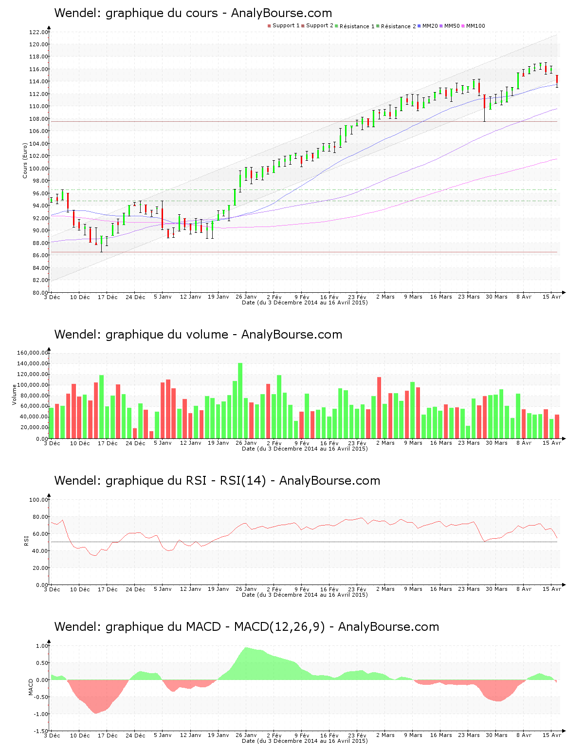 L’action Wendel est en diminution ce jeudi, avec un cours en baisse de 1.94%, avec un volume à 13:27 de 44000 actions échangées. La valeur s’échange finalement à 113.800 €. Wendel était hier peu sollicité, avec un développement plutôt stable de 0.48%. L’évolution en diminution reprend par conséquent ce jeudi. La valeur se place juste en-dessous de son canal. Elle est effectivement sortie ce jeudi 16 avril par la borne inférieure du canal à l’intérieur duquel cette dernière s’enclavait depuis un certain temps.