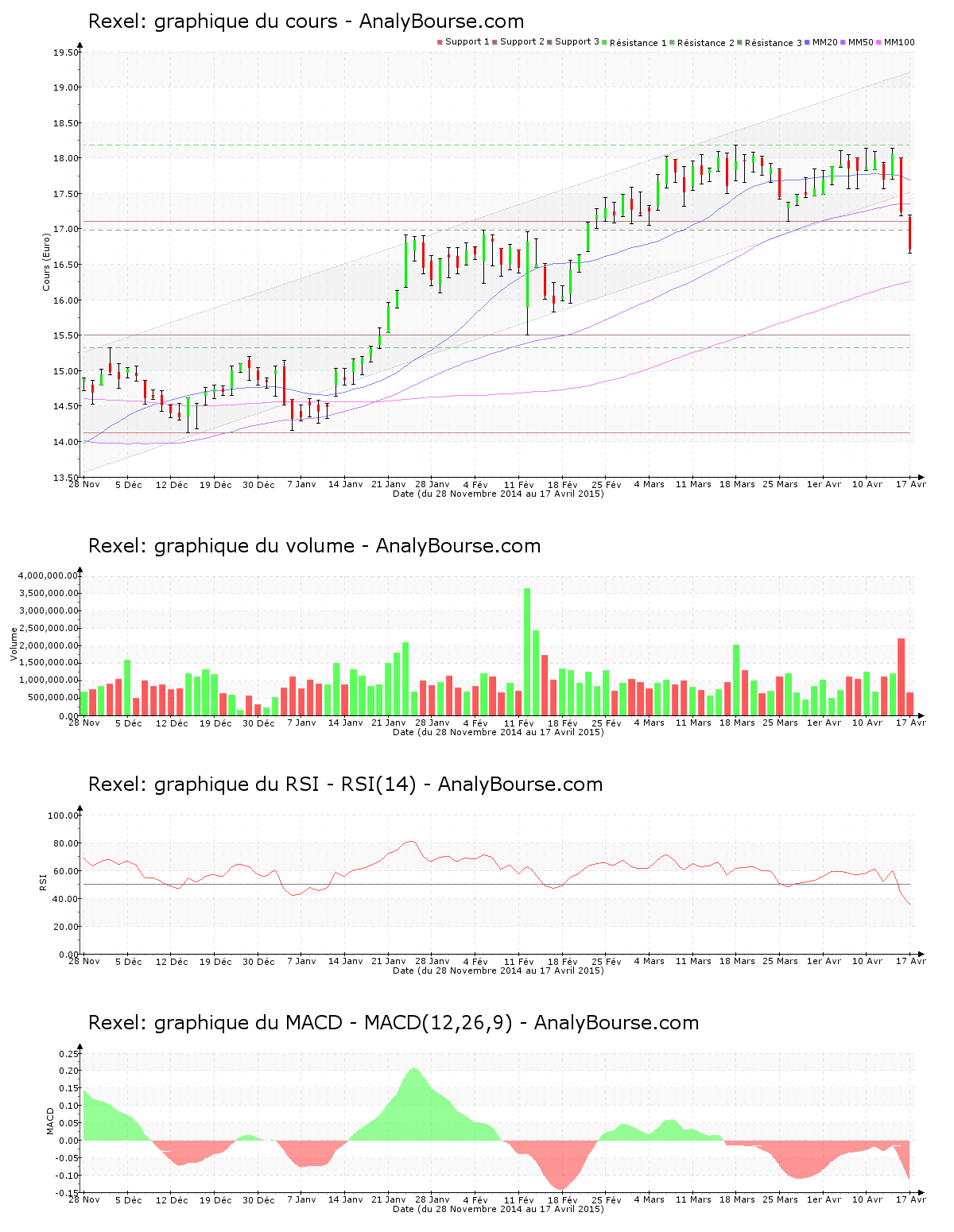 Il s’agit de la première fois depuis plus de 37 jours que l’action Rexel passe ce seuil. Marquée par un mouvement baissier de 3.07%, la valeur Rexel connaît encore ce vendredi 17 avril une ferme pression vendeuse, dans un volume d’environ 656000 actions échangées à 14:27. Illustrée par un mouvement baissier de 4.54%, cette dernière affichait déjà hier une grande pression vendeuse. Naviguant de 17.240 € à 16.710 €, l’action s’effondre désormais de 0.530 €. Notons, avec un pourcentage de 3.18% écartant ce vendredi le plus haut du plus bas, des échanges assez volatils sur Rexel. Le titre a dépassé le support des 17.110 € ce vendredi. Le support suivant se localise à 15.500 €.