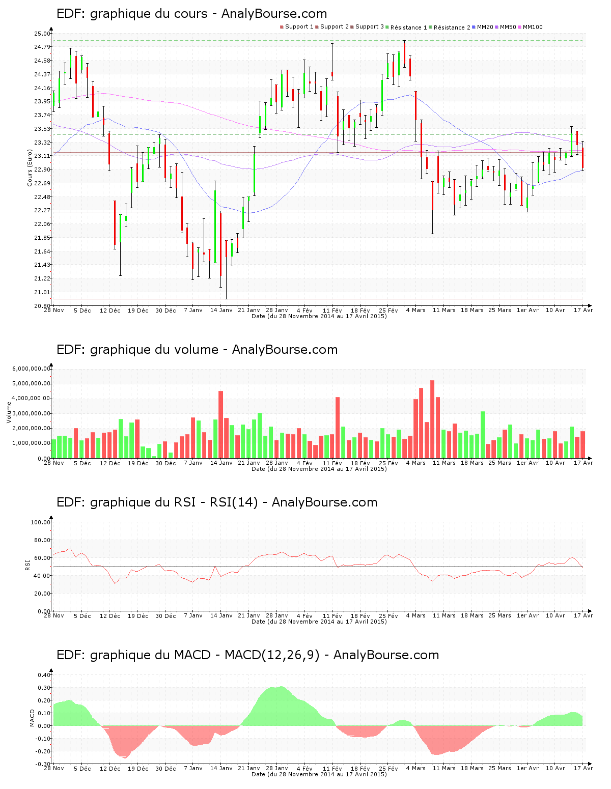 Ces informations constituent une analyse technique de l’action EDF au samedi 18 avril 2015. Cette analyse peut être invalidée par des éléments plus récents, et ne constitue en aucune manière une incitation d’achat ou de vente sur les marchés financiers. Le lecteur reste libre et responsable de l’interprétation et de l’usage faits de ces informations.