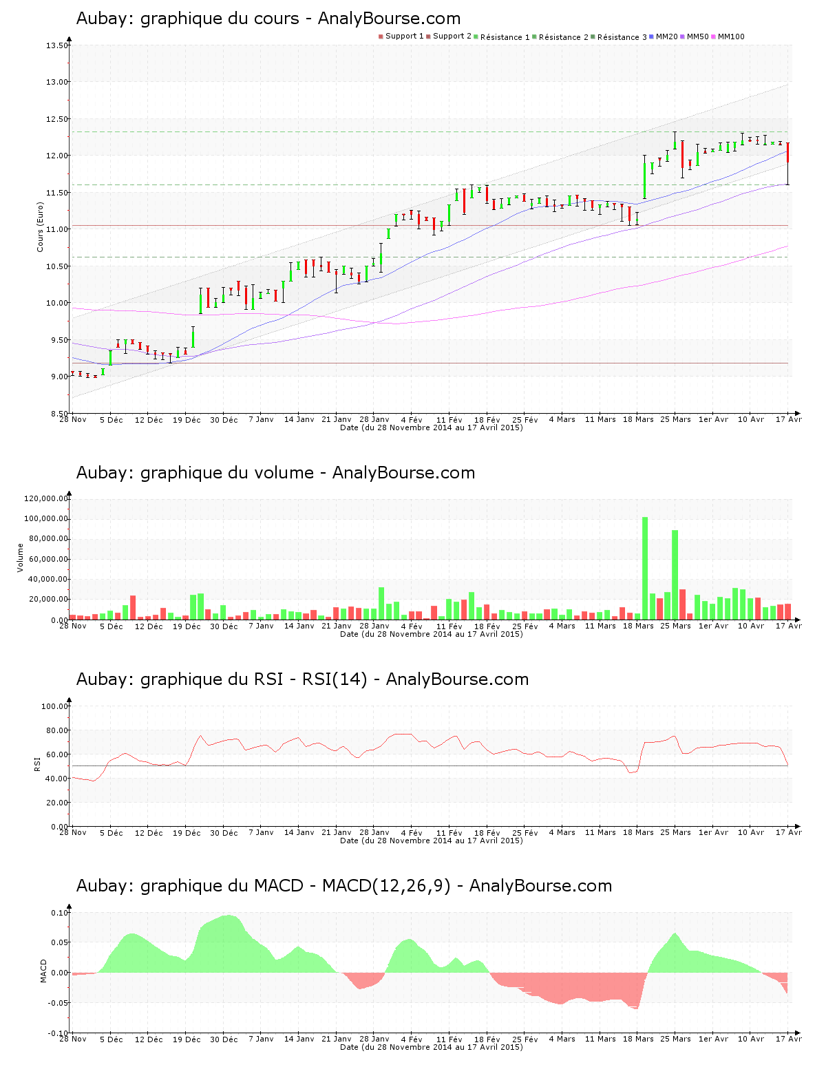 Ces informations constituent une analyse technique de l’action Aubay au samedi 18 avril 2015. Cette analyse peut être invalidée par des éléments plus récents, et ne constitue en aucune manière une incitation d’achat ou de vente sur les marchés financiers. Le lecteur reste libre et responsable de l’interprétation et de l’usage faits de ces informations.