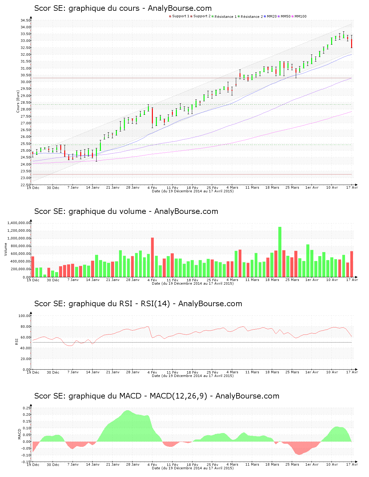 Pour les indicateurs, on remarque que ces cinq dernières séances le RSI est en diminution. C’est malgré ceci toujours au niveau d’achat que ce dernier se place. De son côté, la moyenne mobile sur vingt jours de la valeur Scor SE se place au-delà de la moyenne mobile sur cinquante jours, qui se place quant à elle au-delà de la moyenne mobile sur cent jours. A long terme, l’action enregistre ainsi un cours haussier. Pour finir, on constate que ces cinq dernières séances le MACD est en solide baisse. C’est dorénavant une trajectoire du titre plutôt stable que ce dernier signale à court-moyen terme. Vendredi dernier, le MACD est passé en terrain négatif, ce qui pourrait représenter un prélude d’une évolution baissière sur le long terme pour Scor SE.
