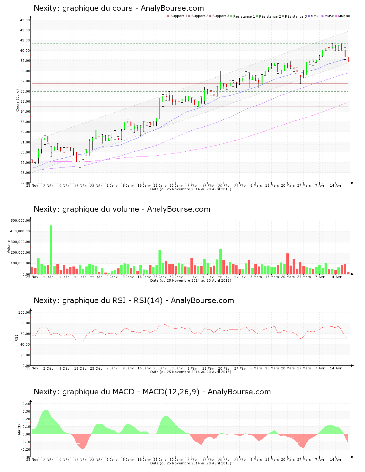 Côté indicateurs, on note que le RSI est en diminution ce lundi. Il est passé au niveau de vente, ce qui peut ébaucher une base d’une orientation décroissante pour la valeur Nexity sur la durée. Concernant l’indicateur MACD, on observe qu’il est en grande décroissance ce lundi. Il révèle désormais une évolution du cours en solide décroissance à court-moyen terme.