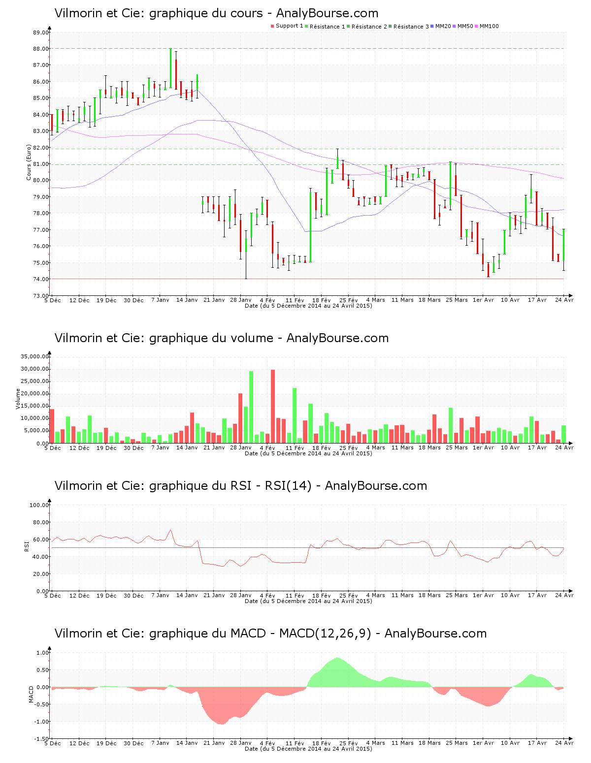 Pour les indicateurs, on repère que l’indicateur RSI est relativement stable ces cinq dernières séances de cotations. C’est donc toujours au niveau neutre qu’il se trouve. De son côté, pour l’indicateur MACD, on observe que ce dernier est en vigoureuse décroissance cette semaine. Il dévoile maintenant une évolution du cours stable à court-moyen terme. L’indicateur MACD a basculé du côté négatif jeudi dernier, ceci pourrait dévoiler un début d’une orientation en décroissance sur une longue période pour Vilmorin et Cie. Pour terminer, la moyenne mobile sur 20 jours de la valeur Vilmorin et Cie se localise en-dessous de la moyenne mobile sur 50 jours, et la moyenne mobile sur 50 jours se situe pour sa part en deçà de la moyenne mobile sur 100 jours. Sur une longue période, le développement de l’action est ainsi en baisse. Depuis maintenant 35 jours, la moyenne mobile sur 50 jours de la valeur Vilmorin et Cie se positionne en deçà de sa moyenne mobile sur 100 jours.