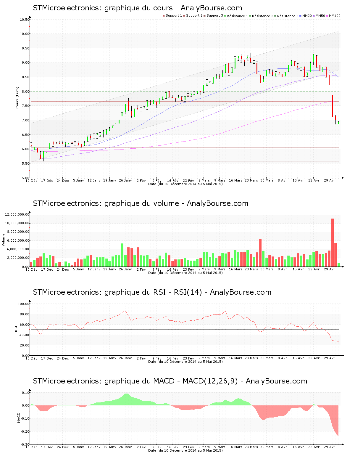 L’action STMicroelectronics est finalement en régression ininterrompue depuis cinq jours de cotations. Le titre de STMicroelectronics est ainsi depuis le mardi 28 avril 2015 affaibli, avec un parcours en ferme baisse de 21.72%. L’action STMicroelectronics cote à son niveau du jeudi 22 janvier 2015. Matérialisée par un cours en décroissance de 1.14%, l’action STMicroelectronics affiche toujours ce jour une pression vendeuse, avec un volume à 09:57 d’environ 817000 actions échangées. Avec un cours baissier de 1.69%, cette dernière s’effritait déjà hier. La valeur diminue désormais de 0.080 €, partant de 7.000 € pour aller à 6.920 €.