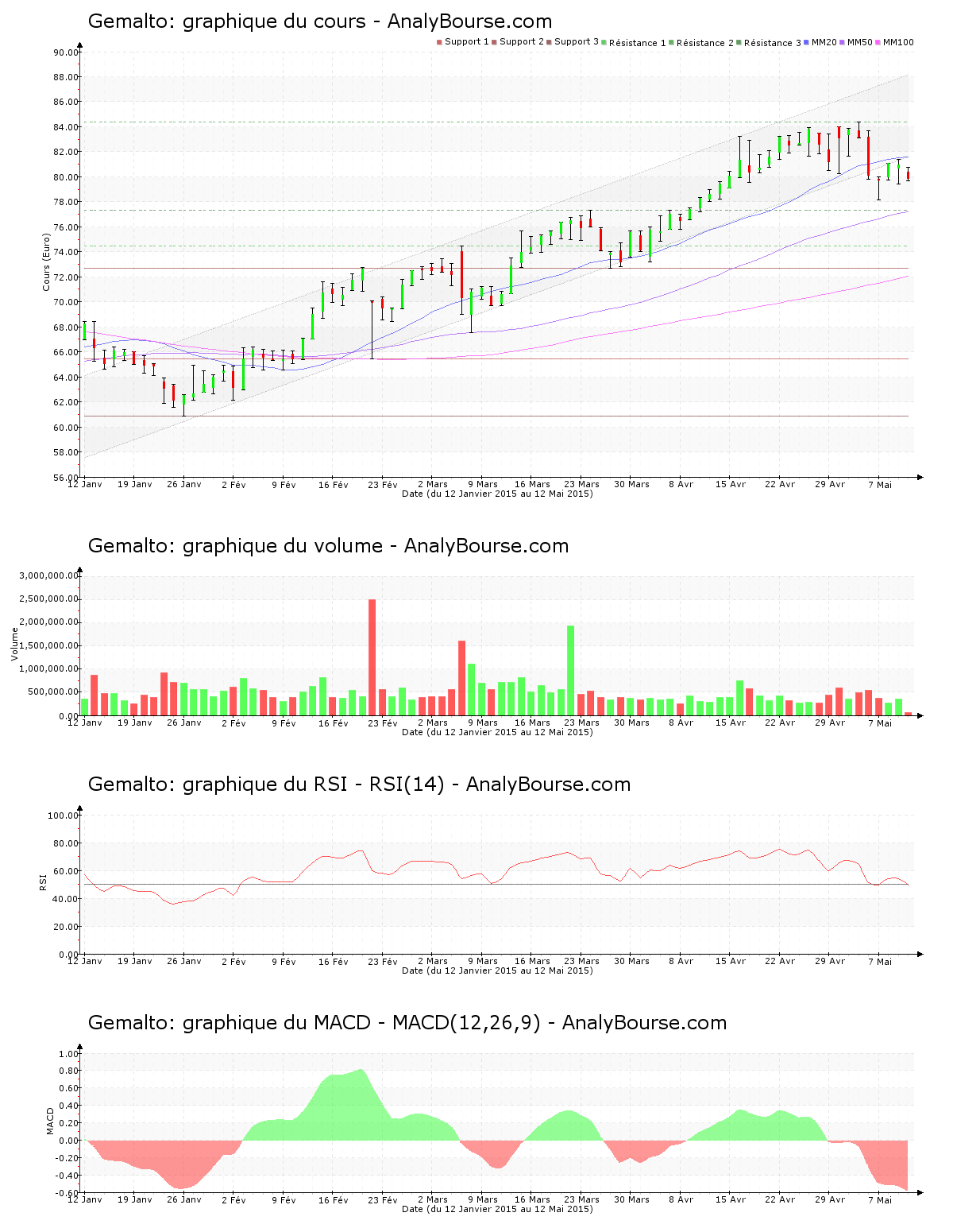 L’intention d’achat sur Gemalto en cinq jours de cotations est extrêmement faible, reflétée par un cours en décroissance de 4.00%. Avec un cours haussier de 2.03%, le cours est à l’inverse en hausse sur un mois. La volonté d’achat sur Gemalto sur un an est néanmoins neutre, imprégnée par un développement haussier de 1.22%.